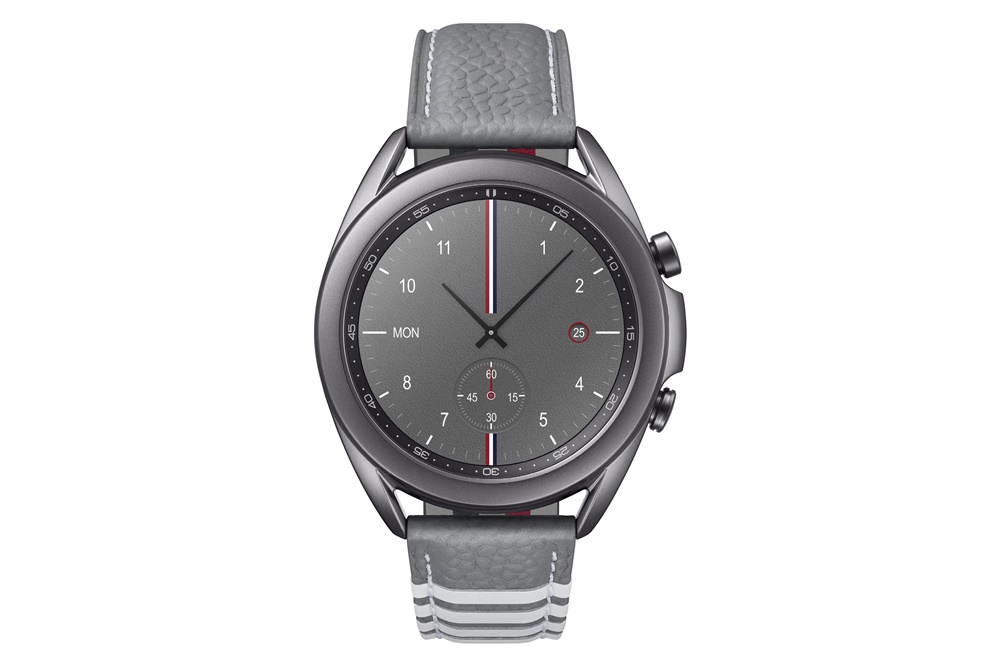 '갤럭시 워치3 톰브라운 에디션'은 그레이 색상의 메탈 프레임에 시그니처 패턴을 적용한 가죽 스트랩을 적용했습니다.