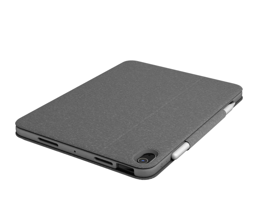 로지텍 폴리오 터치는 부드러운 회색 원단으로 아이패드에 맞는 쉘이 달린 원단으로 제작되었습니다. 후면 카메라를 위한 홀이 있으며 애플펜슬을 위한 공간도 마련되어 있습니다.