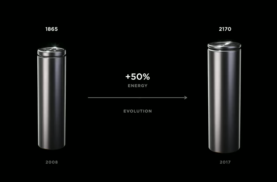 테슬라가 전기차를 만들기 시작한 초창기 18650 배터리 셀을 사용했었습니다. 이 후 2017년 21700 배터리 셀로 변경하면서 50% 가량 에너지량을 증가해 효율 개선을 이룰 수 있었습니다.