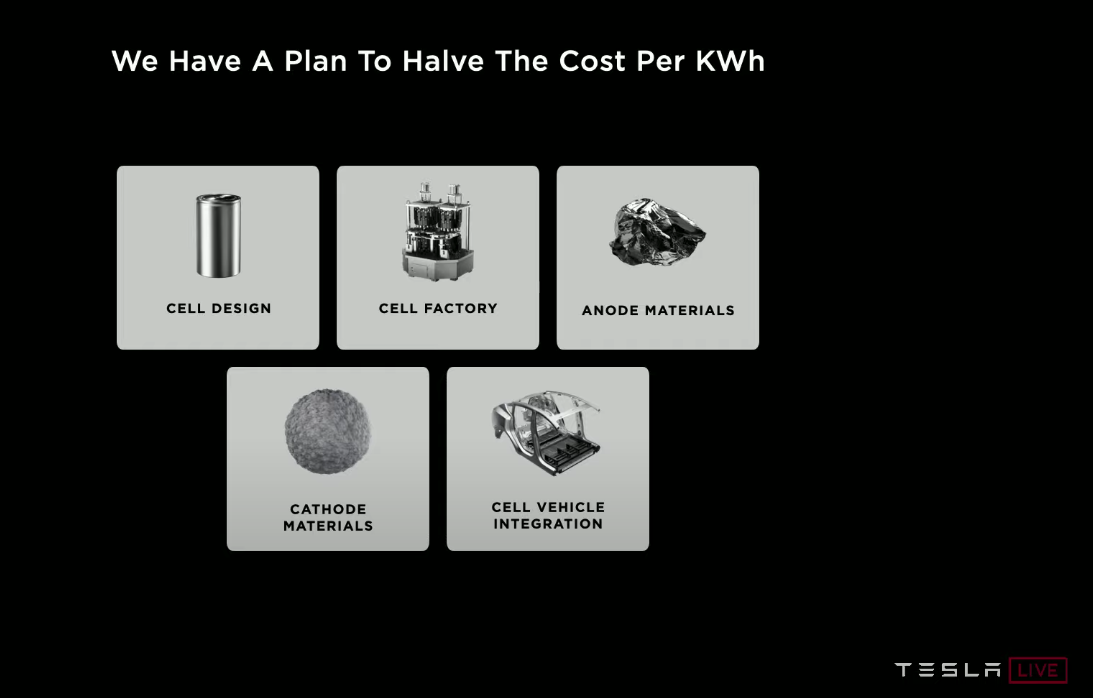 테슬라는 배터리의 원가를 절감하기 위한 방법으로 5가지를 제시했습니다. 배터리 셀 디자인 변경, 공정 개선, 양극재 변경, 음극재 변경, 차량내 셀 비치 등이 5가지 방법에 해당합니다.