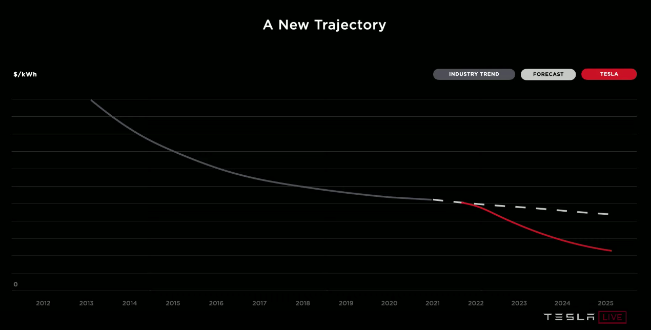 일론 머스크는 전기차의 원가 절감을 통한 대중화를 언급하였습니다. 일론 머스크에 의하면 배터리 공정혁신으로 배터리 가격을 지금보다 56%까지 낮출 수 있으며, 이를 통해 2022년까지 약 25,000달러(약 2900만원) 수준으로 전기차 가격을 낮추겠다는 구체적인 목표를 제시했습니다. 현재 5000만원~7000만원 수준인 '모델 3'의 가격을 3년 내에 절반 수준으로 낮추겠다는 것입니다.