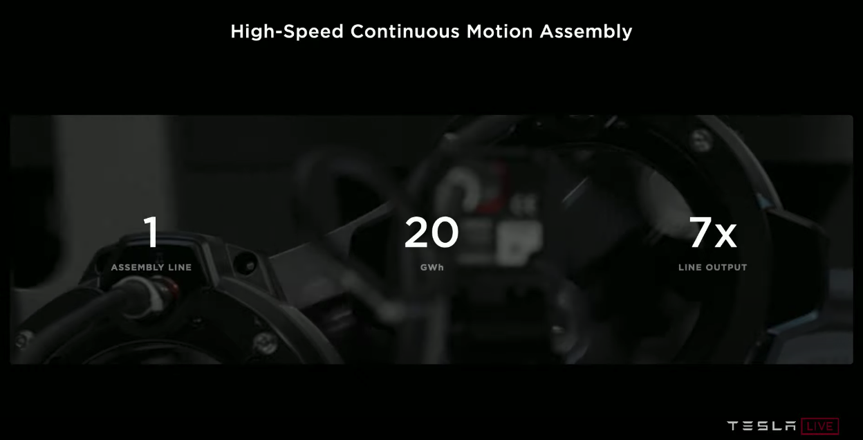 배터리 공장의 조립 라인을 재설계해서 공정을 효율적으로 만드는 부분에 대해서 언급되었습니다. 컨베이어 공정을 없애는 등 조립라인을 개선 설계해서 1개의 조립 라인에서 20GWh 배터리를 생산하며, 기존 대비 7배의 아웃풋을 만들어 낼 수 있다는 설명입니다.
