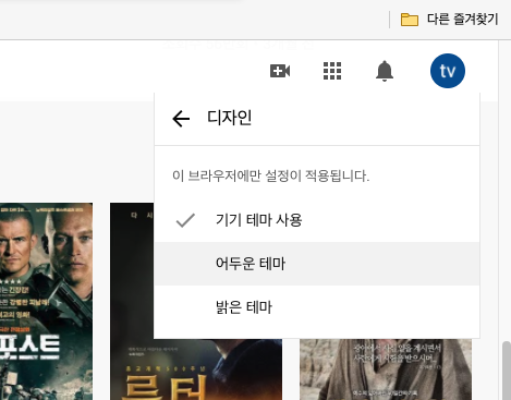 서브 메뉴로 브라우저의 테마에 맞춰 설정되는 '기기 테마 사용'과 다크모드를 적용하는 '어두운 테마', 화이트모드를 적용하는 '밝은 테마'를 선택할 수 있습니다. '어두운 테마'를 선택하면 다크모드가 적용됩니다.