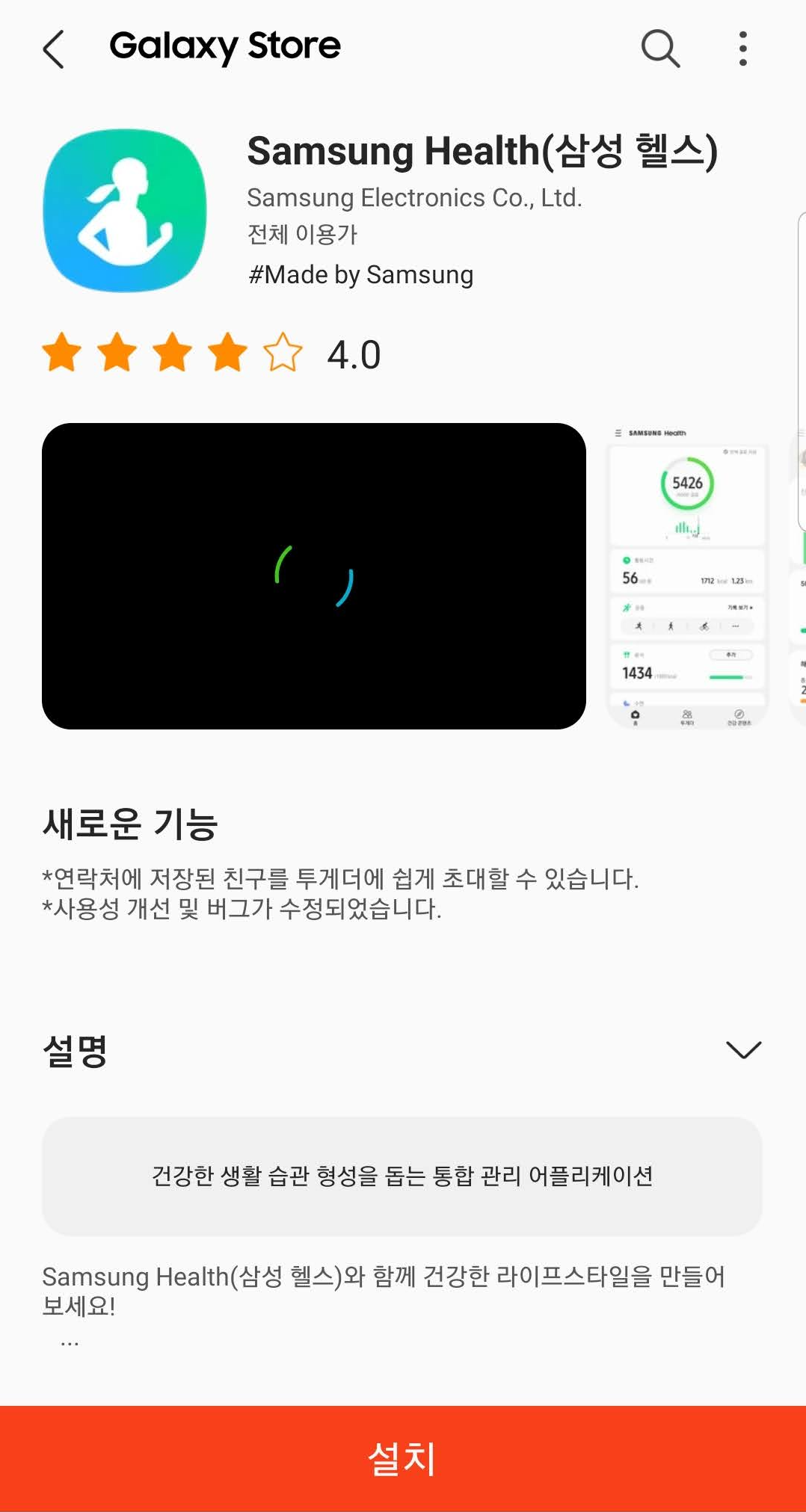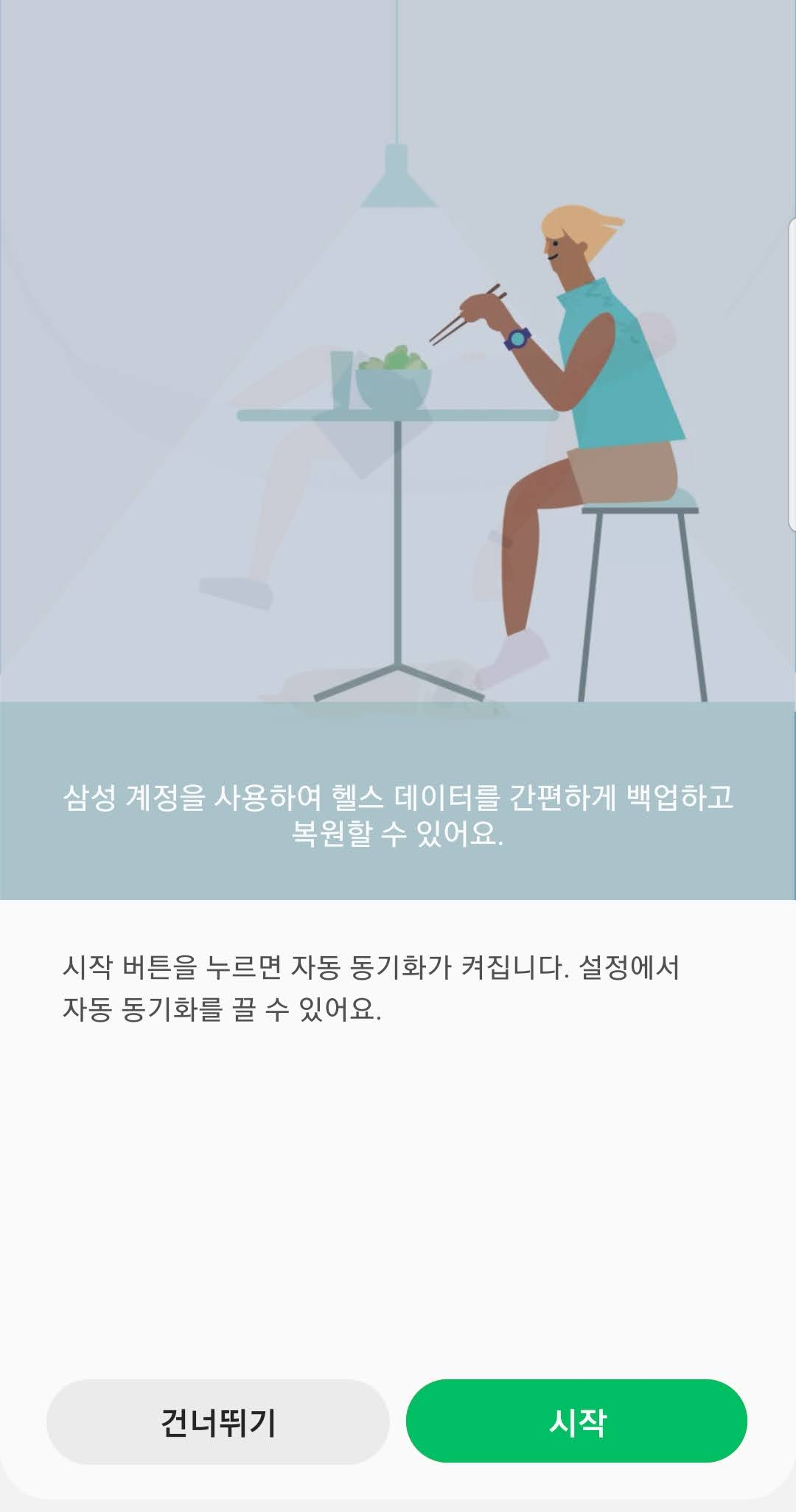 삼성헬스 앱을 설치해줍니다. '시작' 버튼을 눌러 자동 동기화를 켜줍니다.
