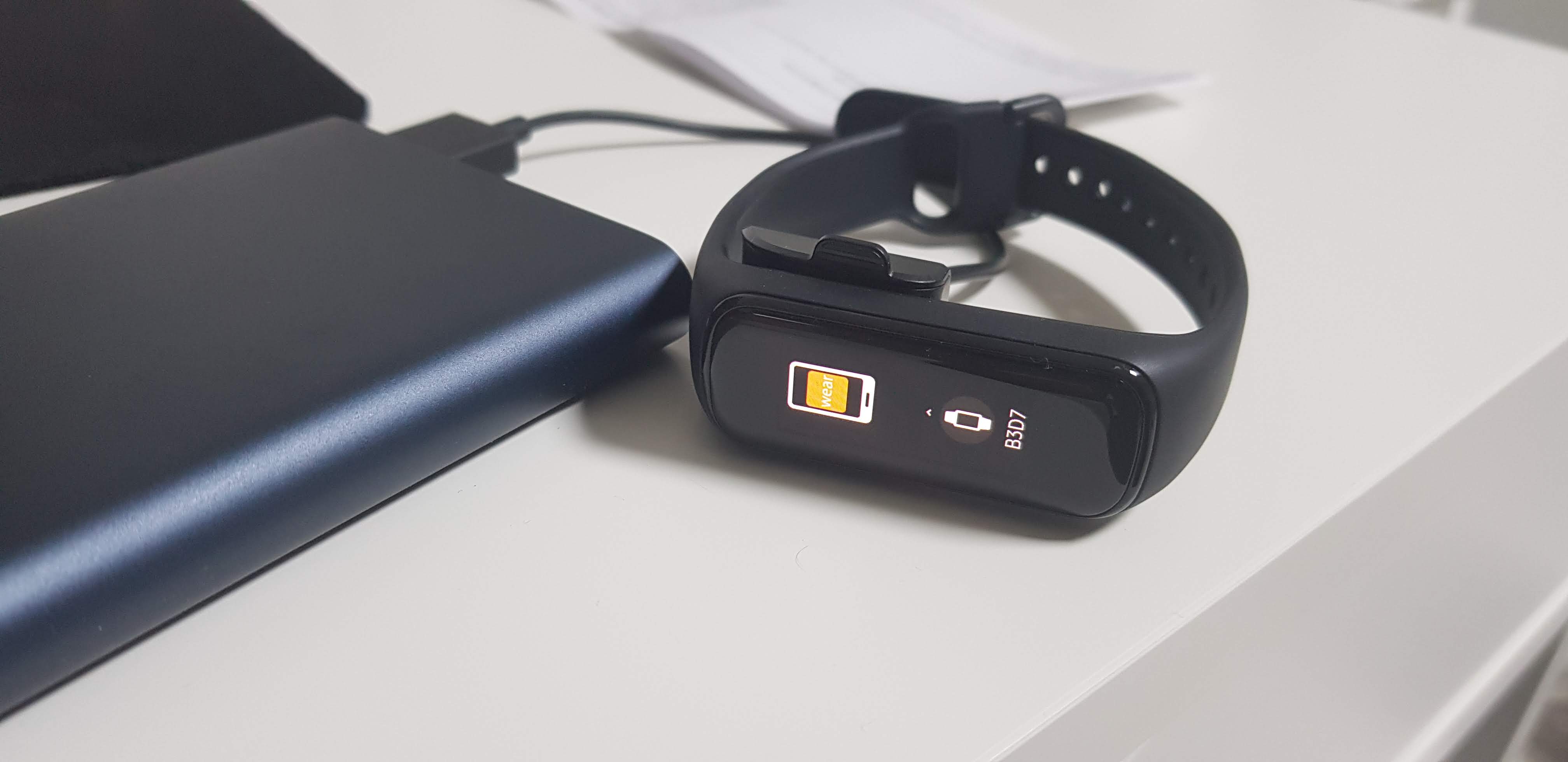'갤럭시핏2'는 별도의 전원이 없습니다. 전원을 켜고 끄는 방법은 없으며, 배터리 충전을 하면 전원이 켜집니다. 샤오미 보조배터리로 충전을 해봤습니다.