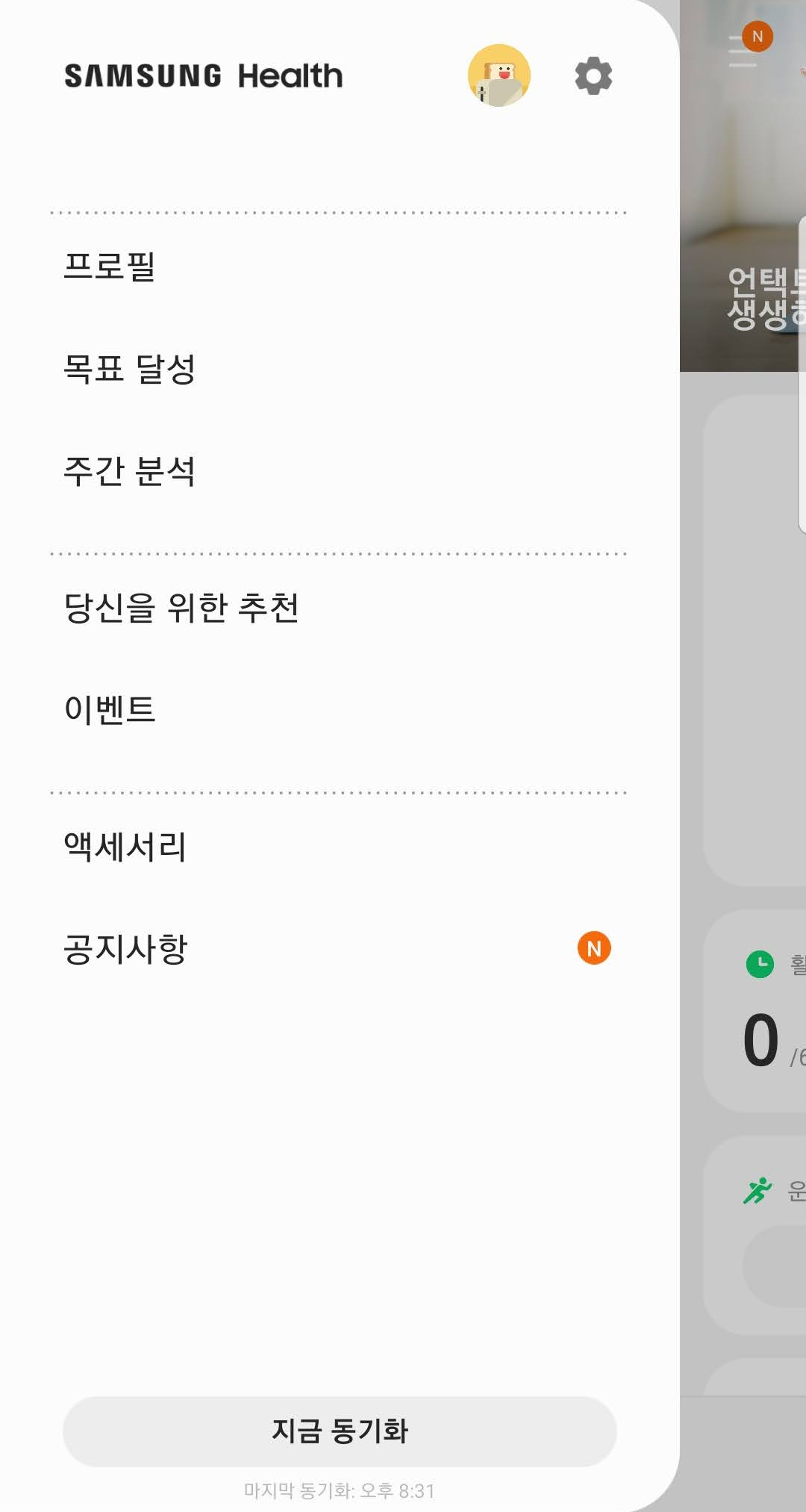 앱의 좌측 상단의 햄버거 버튼을 클릭해보면 메뉴가 나오는데요. '액세서리' 항목을 선택하면 삼성헬스와 연동될 수 있는 디바이스와 연동되어 있는 디바이스들을 볼 수 있습니다.