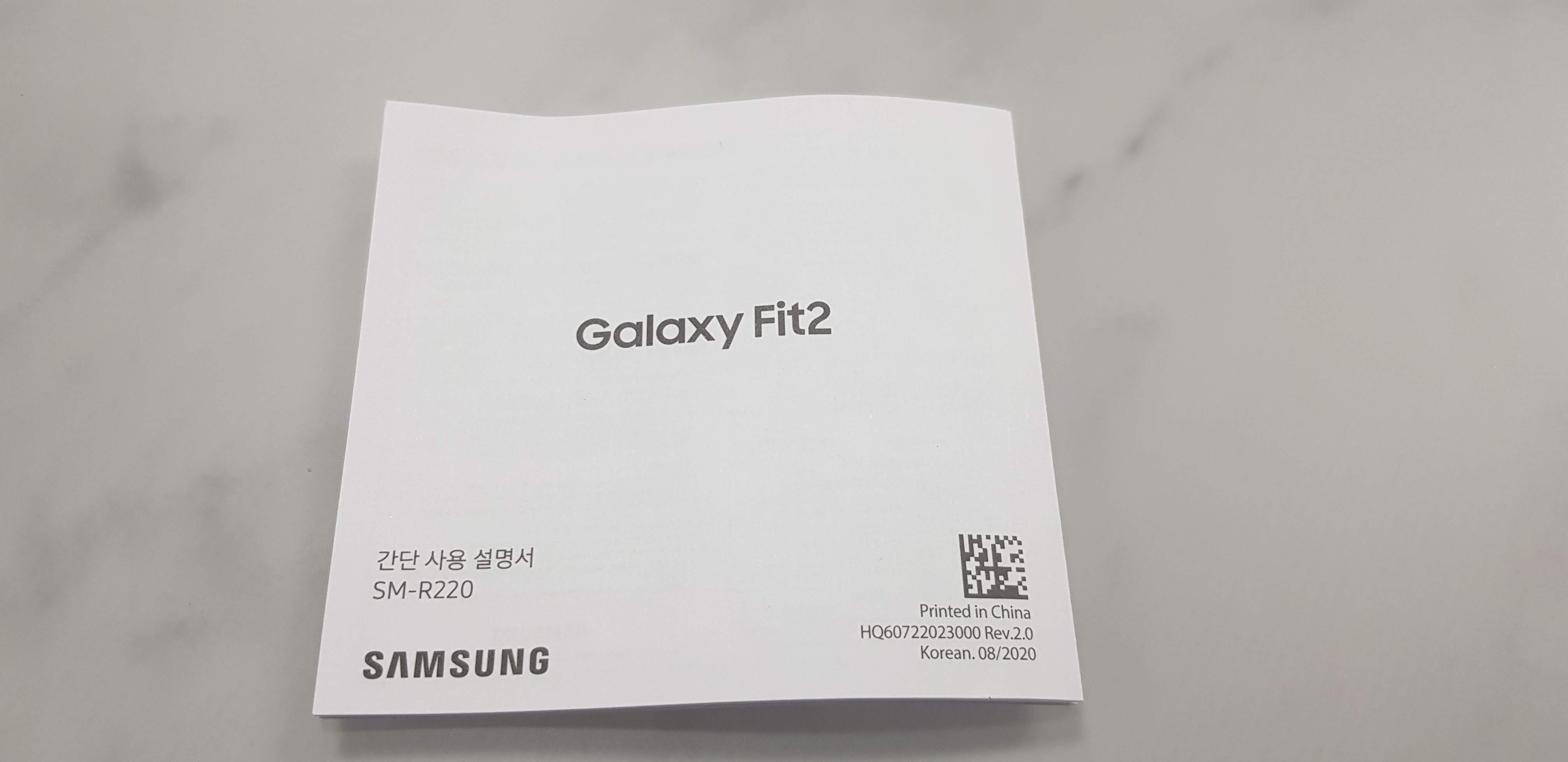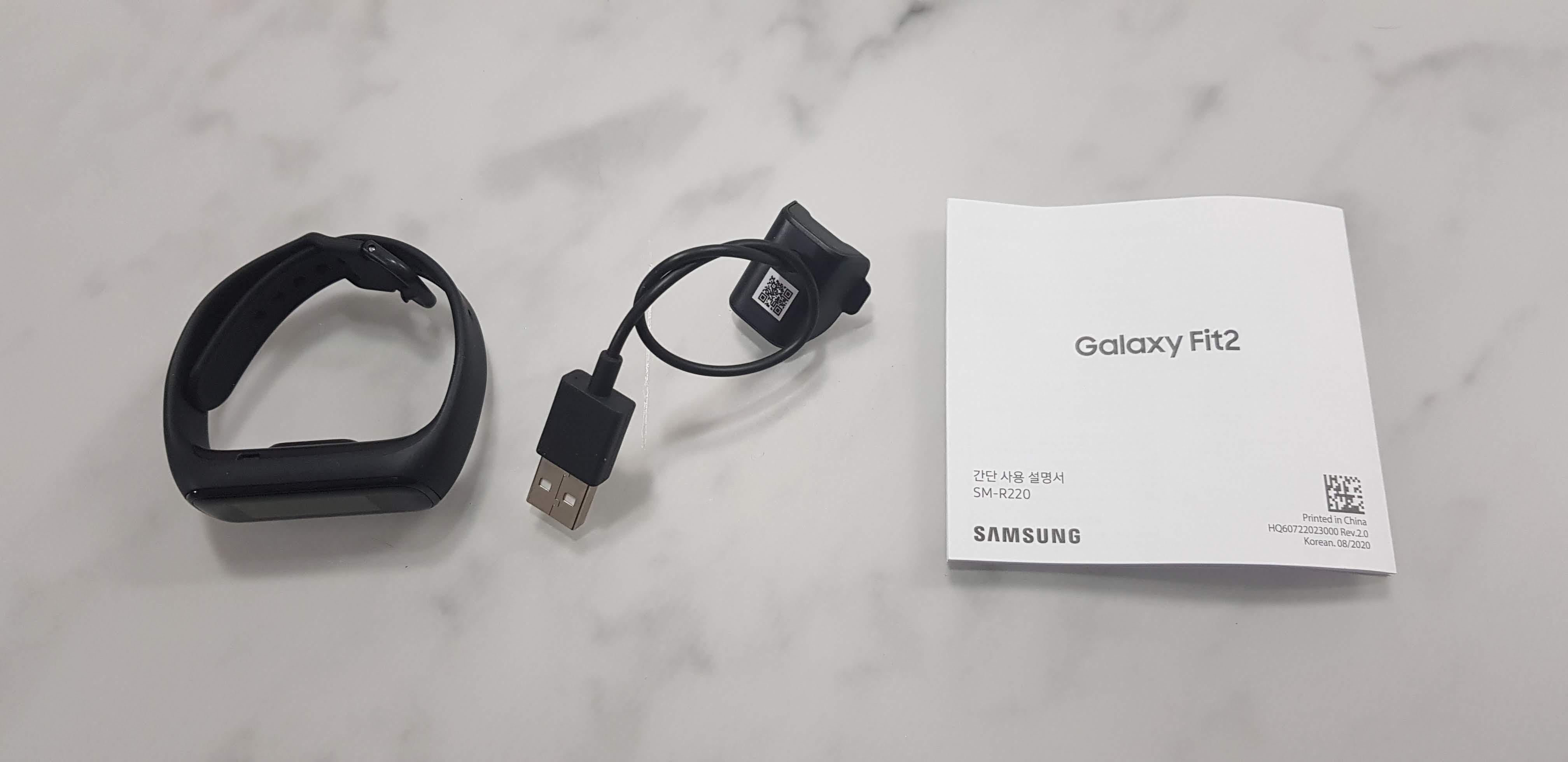패키지 박스를 열어보면 '갤럭시핏2' 제품과 충전 케이블, 간단 사용 설명서가 들어있습니다. 별도의 충전 어댑터는 들어있지 않으며 USB-A 타입의 단자를 통해 충전할 수 있습니다.