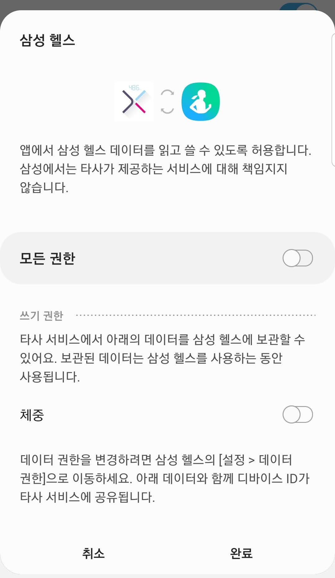 '모든권한'을 활성화해서 피쿡에서 삼성헬스로 넘겨줄 수 있는 데이터를 넘겨줍니다.