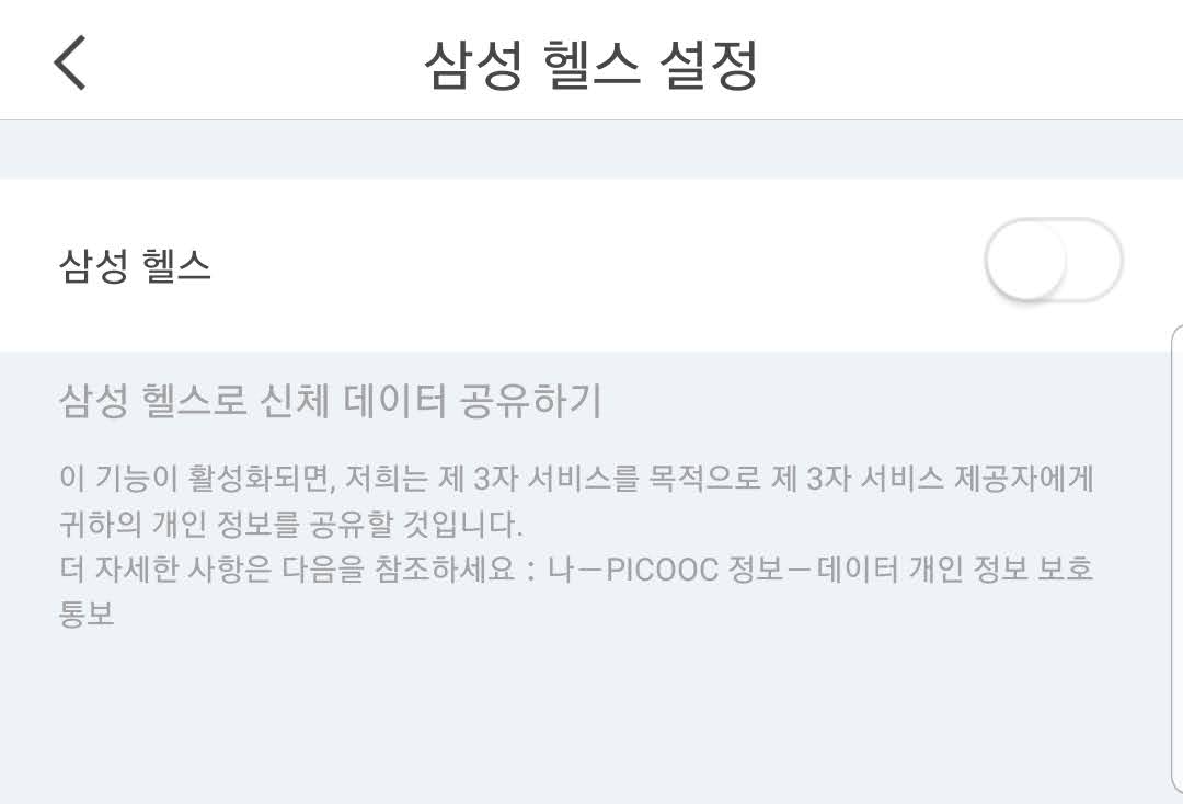 삼성헬스 설정을 활성화시킵니다. 피쿡에서 데이터를 삼성헬스 앱으로 넘겨준다는 의미입니다. 회사 앱간 데이터를 넘겨주는거라 사용자의 동의가 필요합니다.