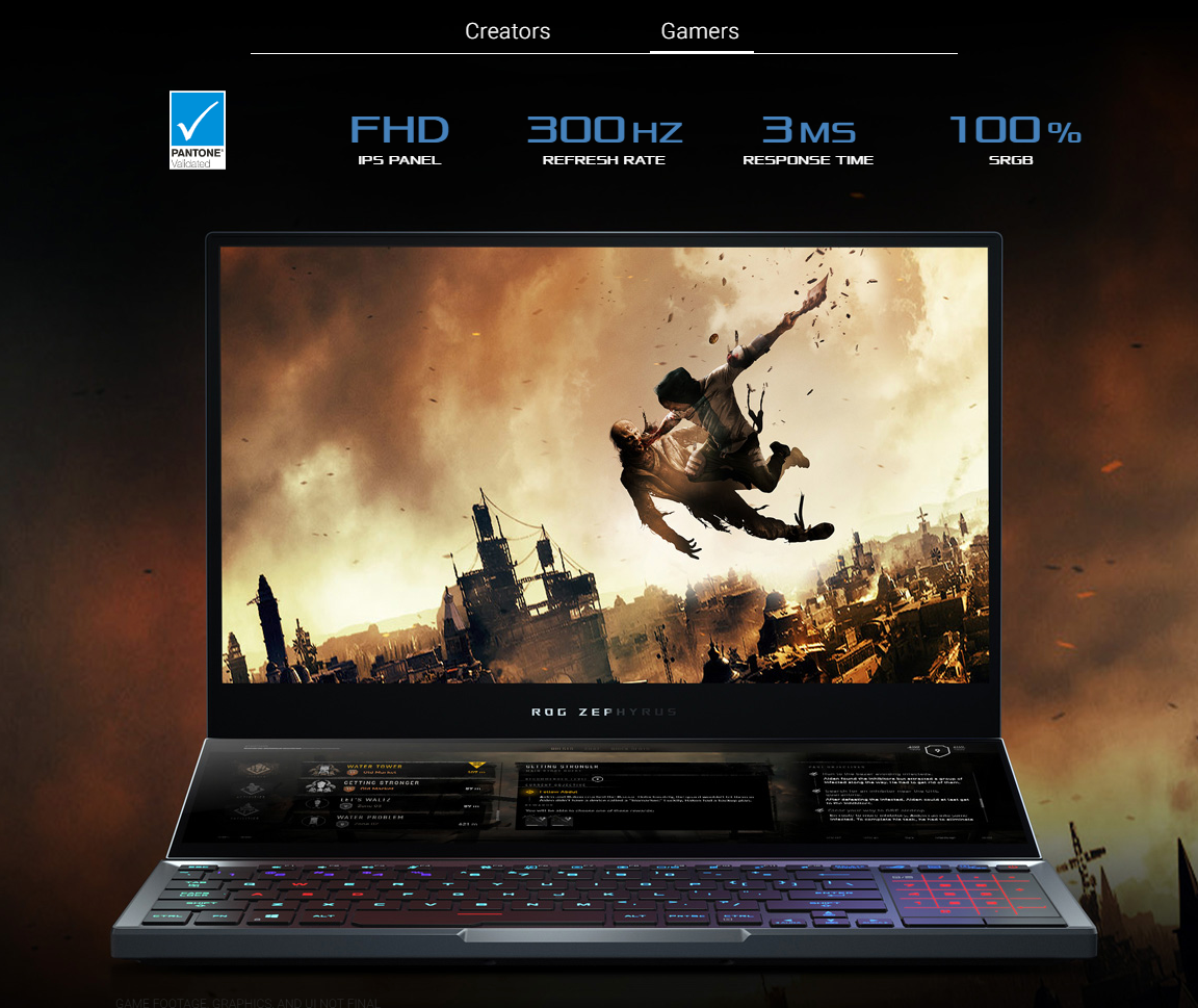 노트북을 열면 세로로 기다란 화면이 열리고 그 아래로 세컨드 스크린이 쭉 늘어집니다. 세컨드 스크린이 살짝 들리기 때문에 내려다보는 각도가 불편하지는 않을 것 같습니다. 게임 플레이할 때 확장 디스플레이를 이용할 수 있을지는 잘 모르겠지만 영상편집 같은 툴을 사용할 때 다양한 용도로 쓸 수 있을 것 같습니다. 맥북 프로의 터치바를 이용하는 것처럼 애플리케이션이나 게임마다 세컨드 스크린을 잘 활용할 수 있을 것 같습니다. 세컨드 스크린이 터치가 되긴 하지만 제피로스 듀오만을 위한 인터페이스를 최적화시켜줄 소프트웨어 회사가 있을지는 잘 모르겠습니다.