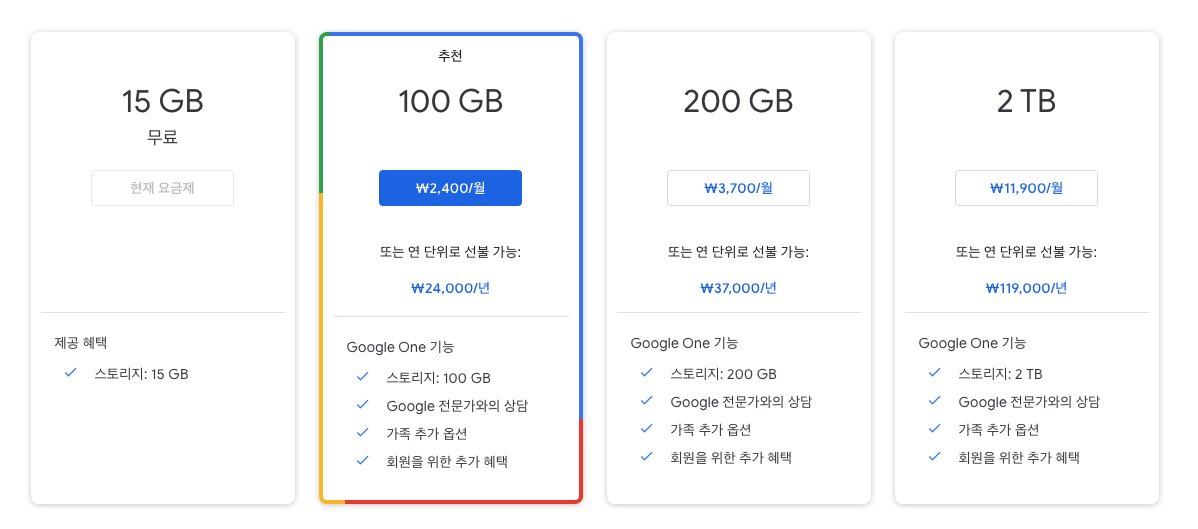 한달 2400원 혹은 1년에 24000원을 지불하면 100GB 저장공간과 다양한 혜택을 누릴 수 있습니다. 그렇지만 무료로 사용하던 사용자들이 바로 구글원을 구독할 것 같지는 않습니다. 그 동안 업로드해놨던 사진은 15GB 용량에 계산이 안되기 때문입니다.