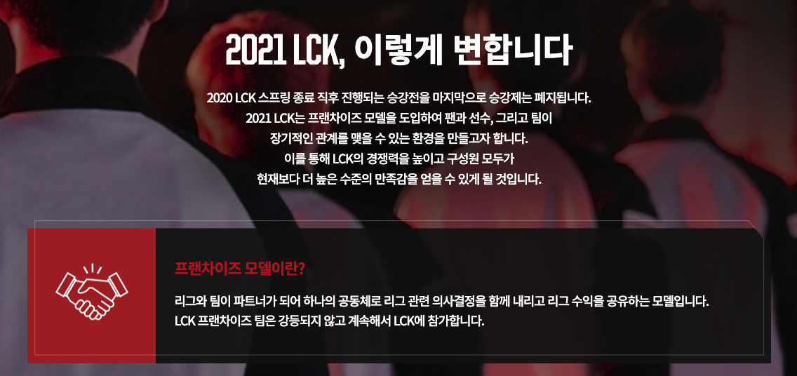 이에 롤 챔스 코리아는 프랜차이즈 모델을 도입하기로 했습니다. "리그와 팀이 파트너가 되어 하나의 공동체로 리그 관련 의사결정을 함께 내리고 리그 수익을 공유하는 모델입니다. LCK 프랜차이즈 팀은 강등되지 않고 계속해서 LCK에 참가합니다" 라고 LCK는 설명하고 있습니다.