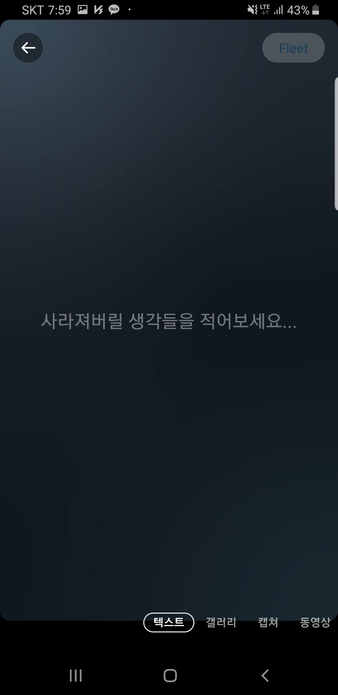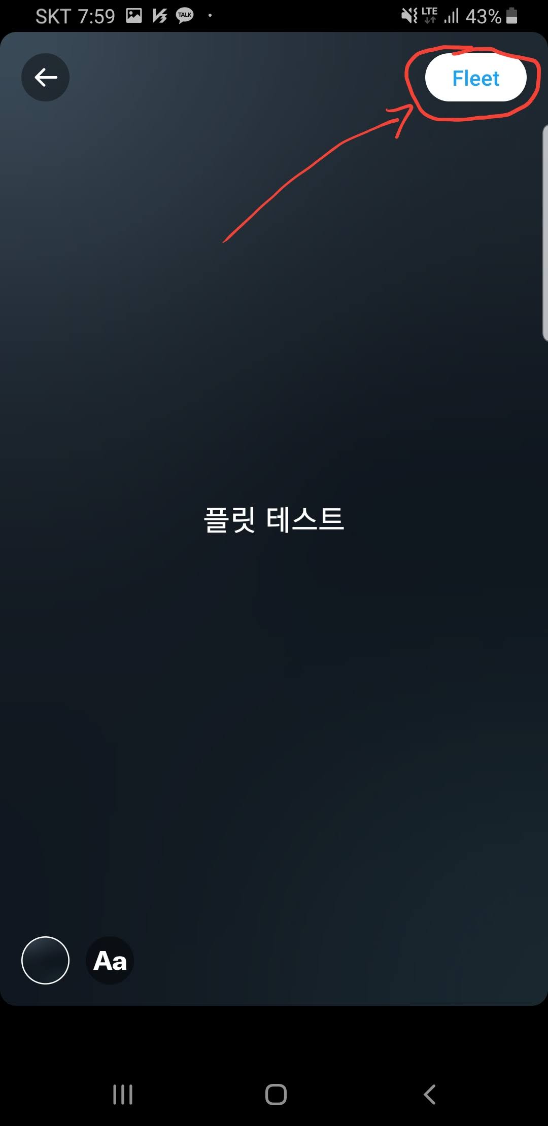 텍스트 혹은 사진, 동영상을 선택하고 우측 상단에 있는 'Fleet' 버튼을 누르면 플릿이 발생됩니다.