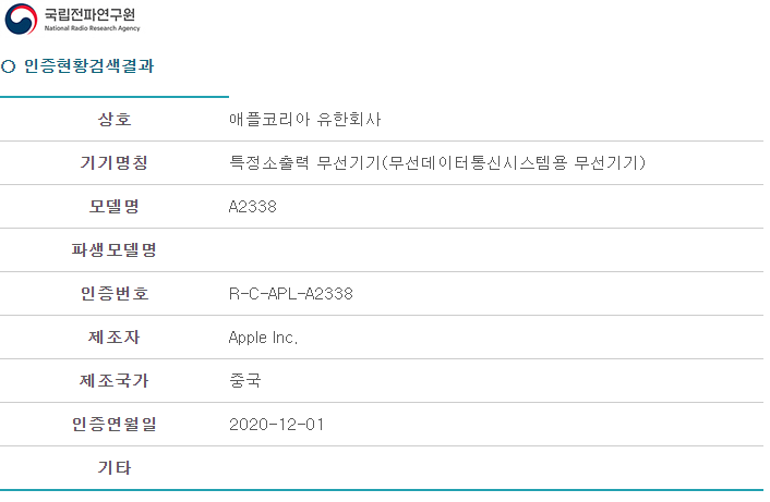 국립전파연구원에 의하면 A2337, A2338이라는 모델의 제품이 전파인증은 받았습니다. 모델명 A2337은 애플 실리콘이 탑재된 '맥북 에어' 제품이고 A2338은 애플 실리콘이 탑재된 '맥북 프로'입니다.