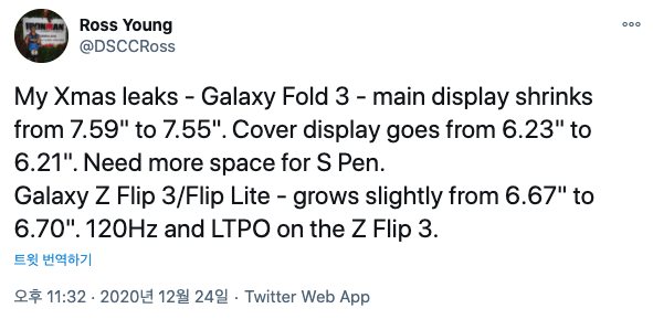 Ross Young은 '갤럭시 Z 플립 3'가 6.7인치 디스플레이를 탑재하면서 '갤럭시 Z 플립 5G'보다 약간 더 커질 예정이고, 120Hz 주사율과 LTPO 기술을 적용할 것이라고 언급했습니다.