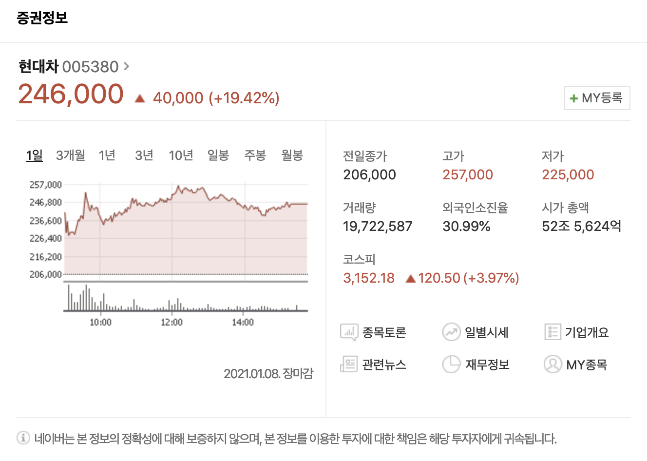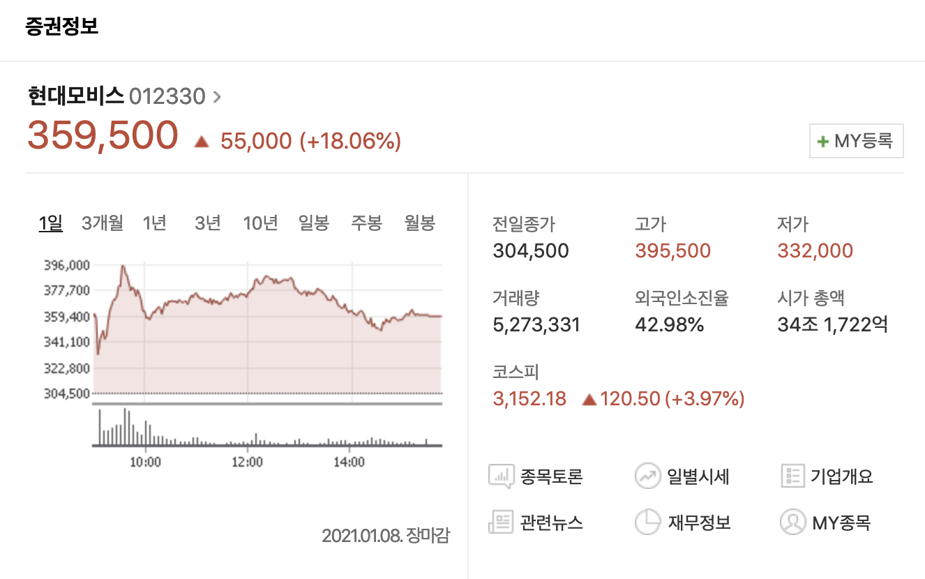애플의 힘이 이렇게 대단할까요? 현대자동차와 현대모비스의 주가가 1월 8일 하루에만 20% 가량 급등했습니다. (현대차를 12만원에 팔아버린 제 손은 오늘도 1패를 했습니다.)