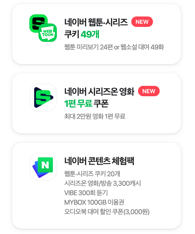 여기에 웹툰 쿠키 49개, 시리즈온 영화 한편, 디지털 컨텐츠 체험 팩 중 1개를 선택할 수 있었습니다. 여기에 티빙 이용권이 새롭게 추가될 예정입니다.