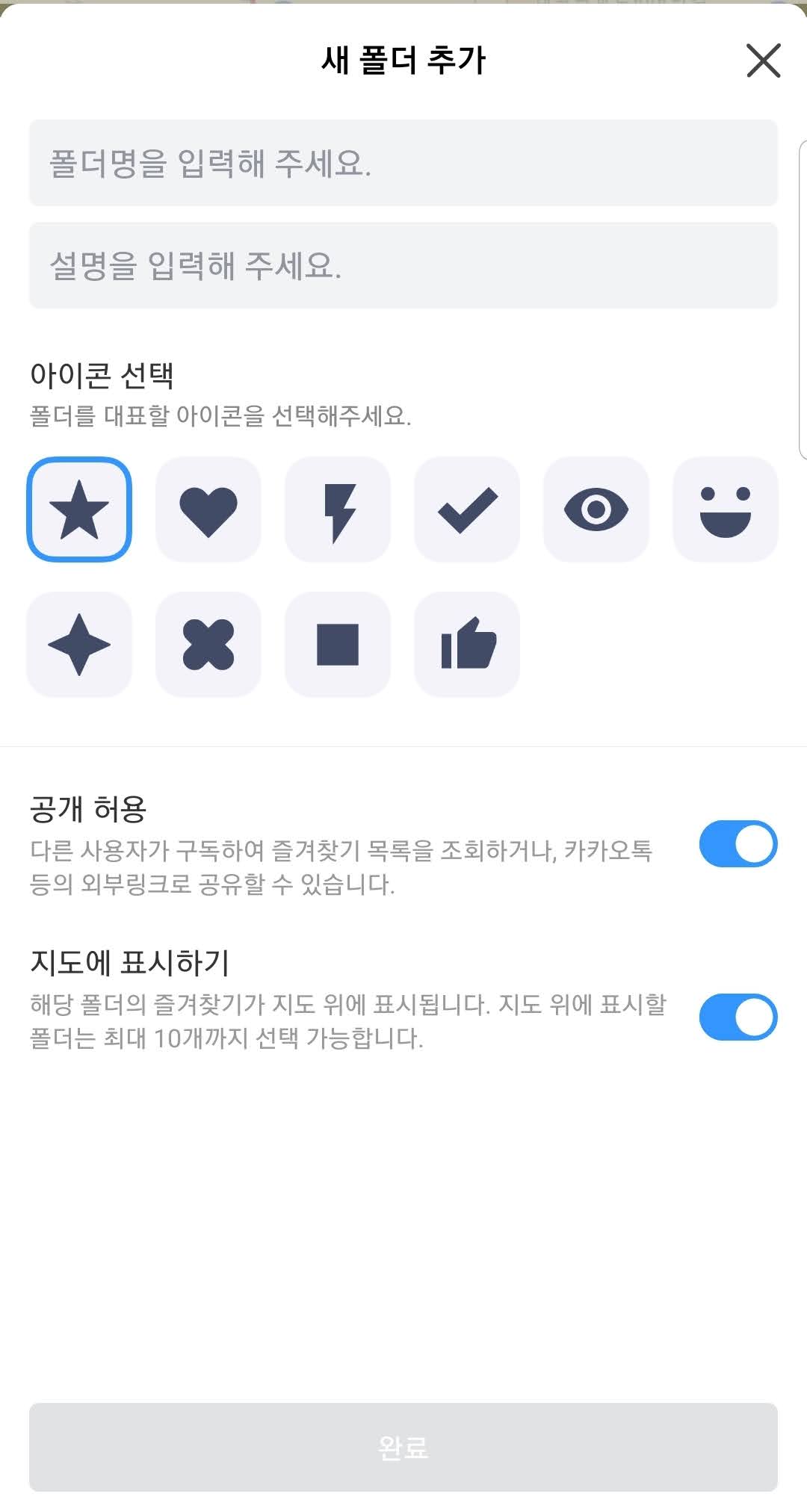 즐겨찾기 폴더를 전체공개로 설정하는 방법은 카카오맵의 공지에 잘 설명되어 있습니다.