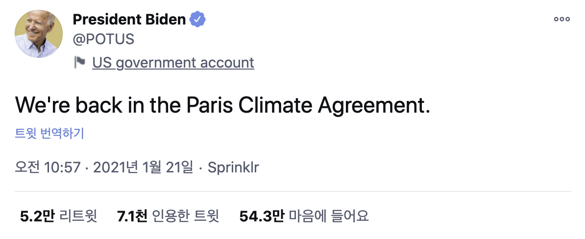 '조 바이든' 미국 대통령이 취임 직후 기후변화에 대응하기 위한 파리협정에 재합류한다는 행정명령에 서명했습니다. 현지시간 20일 대통령 집무실에서 총 17건의 행정명령에 서명했으며, 이중 3번째가 파리협정에 복귀한다는 내용의 행정명령이라고 합니다.