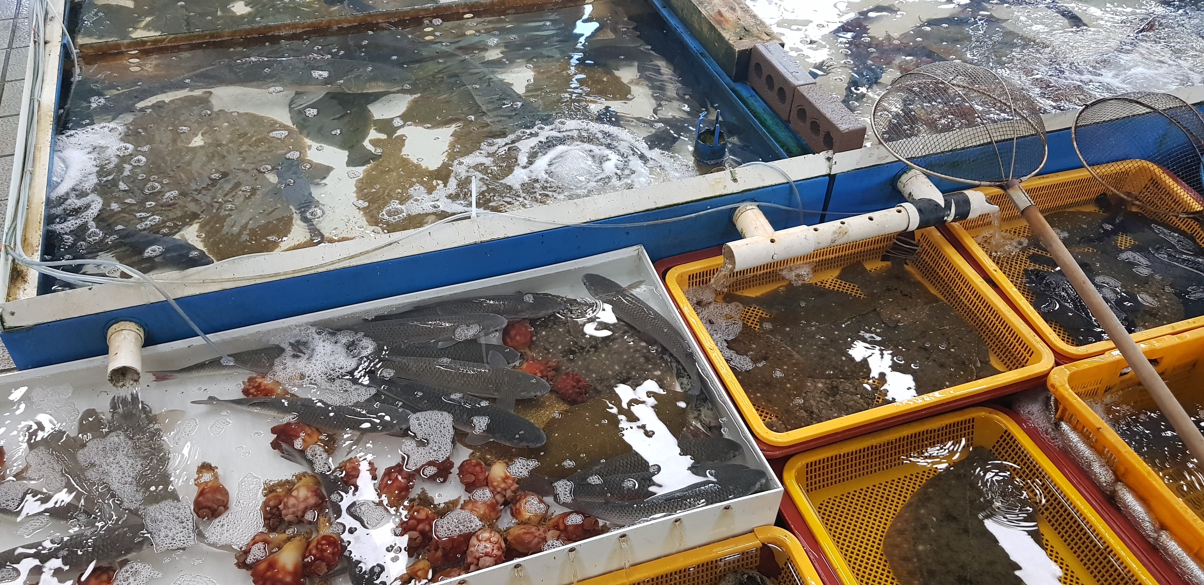 황영수산이라는 곳에서 횟감을 구입하고 바로 옆에 회를 떠주는 가게가 따로 있었습니다. 약간의 손질 비용을 지불하면 회를 맛있게 떠 줍니다. 신기했던건 회뜨는 기계가 있어서 몇몇 횟감은 기계에 넣으면 바로 손질이 되었습니다.