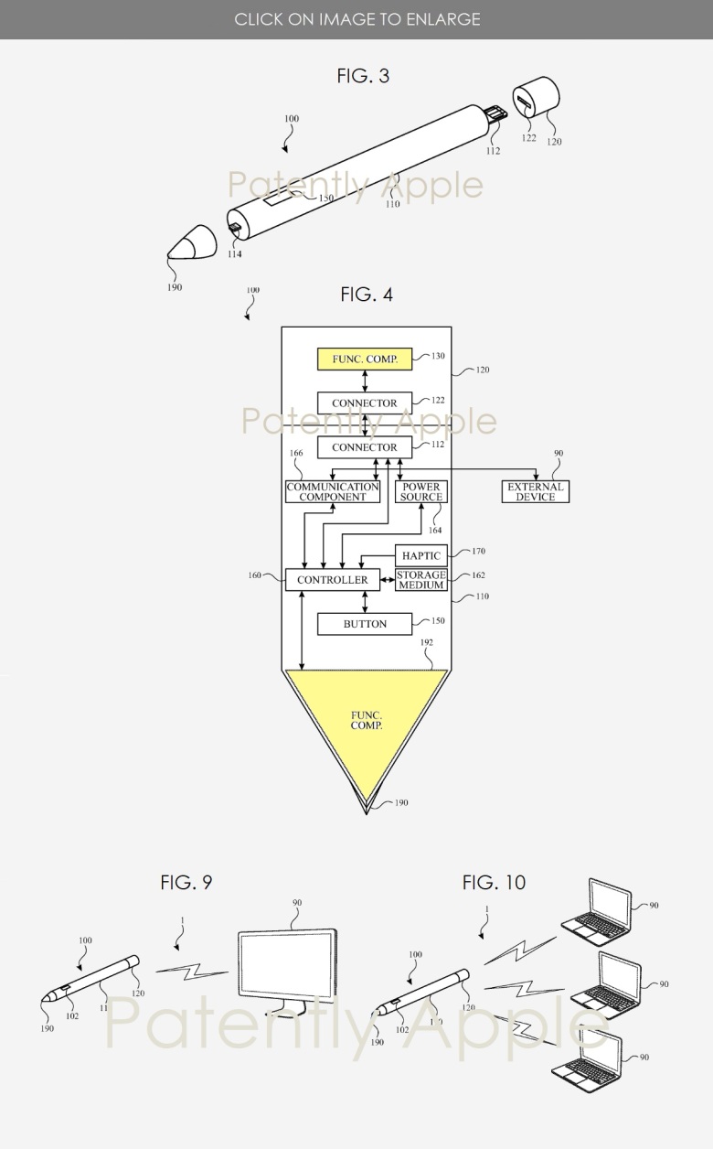 4번 그림을 보면 애플 펜슬의 양쪽 끝단에 교체가능한 모듈(노란색)이 위치해있고, 펜슬의 바디부분에는 교체가능한 기능들을 제공하기 위한 다양한 컴포넌트들이 위치하고 있습니다.