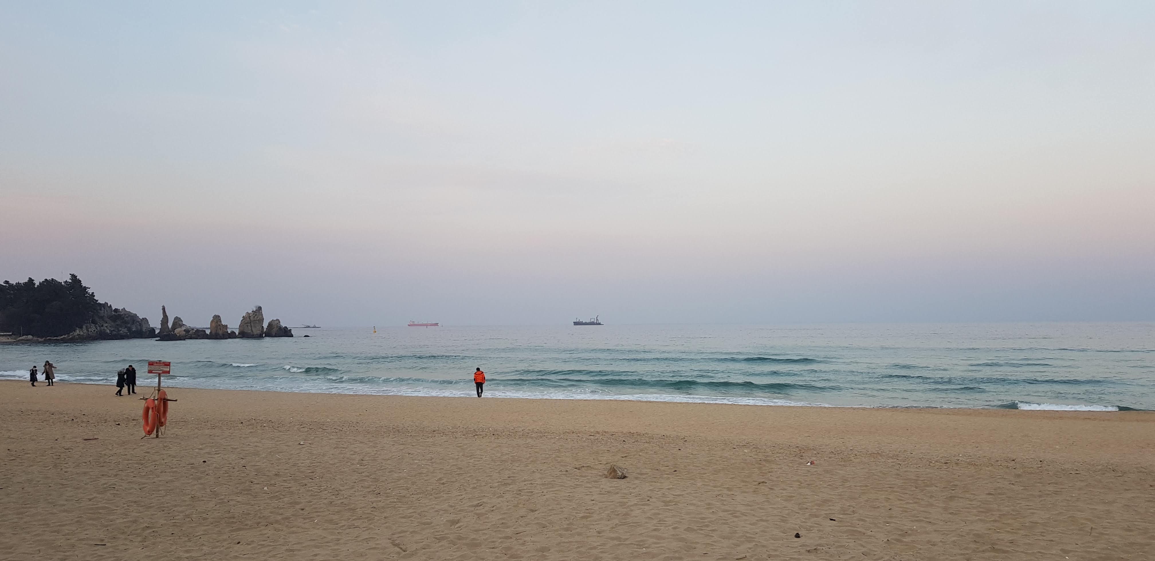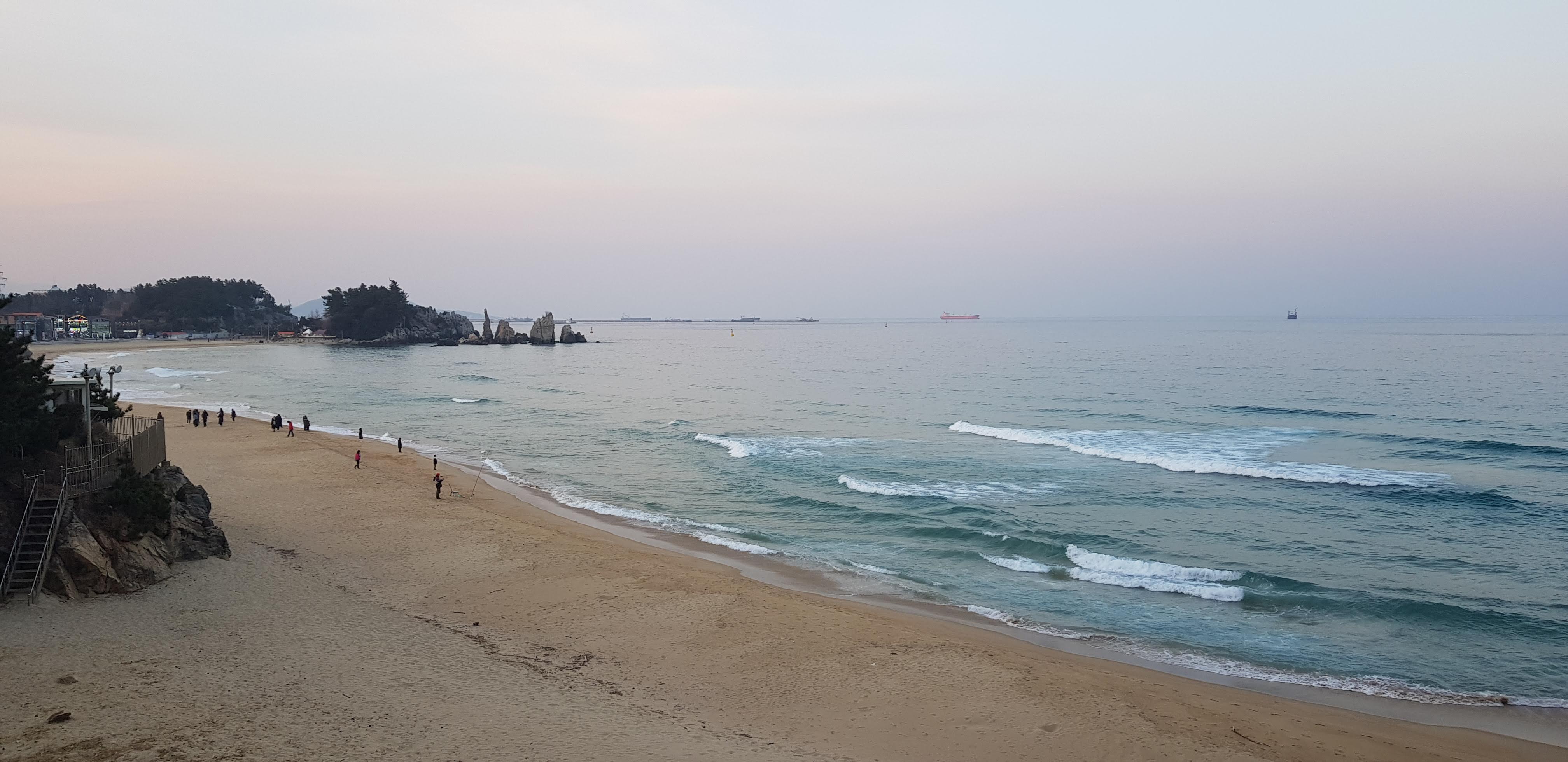 관광객들이 겨울 바다의 분위기를 만끽하고 있습니다. 다들 사진 촬영에 여념이 없는 모습이었습니다. 이 해변의 이름은 '증산 해변'입니다.