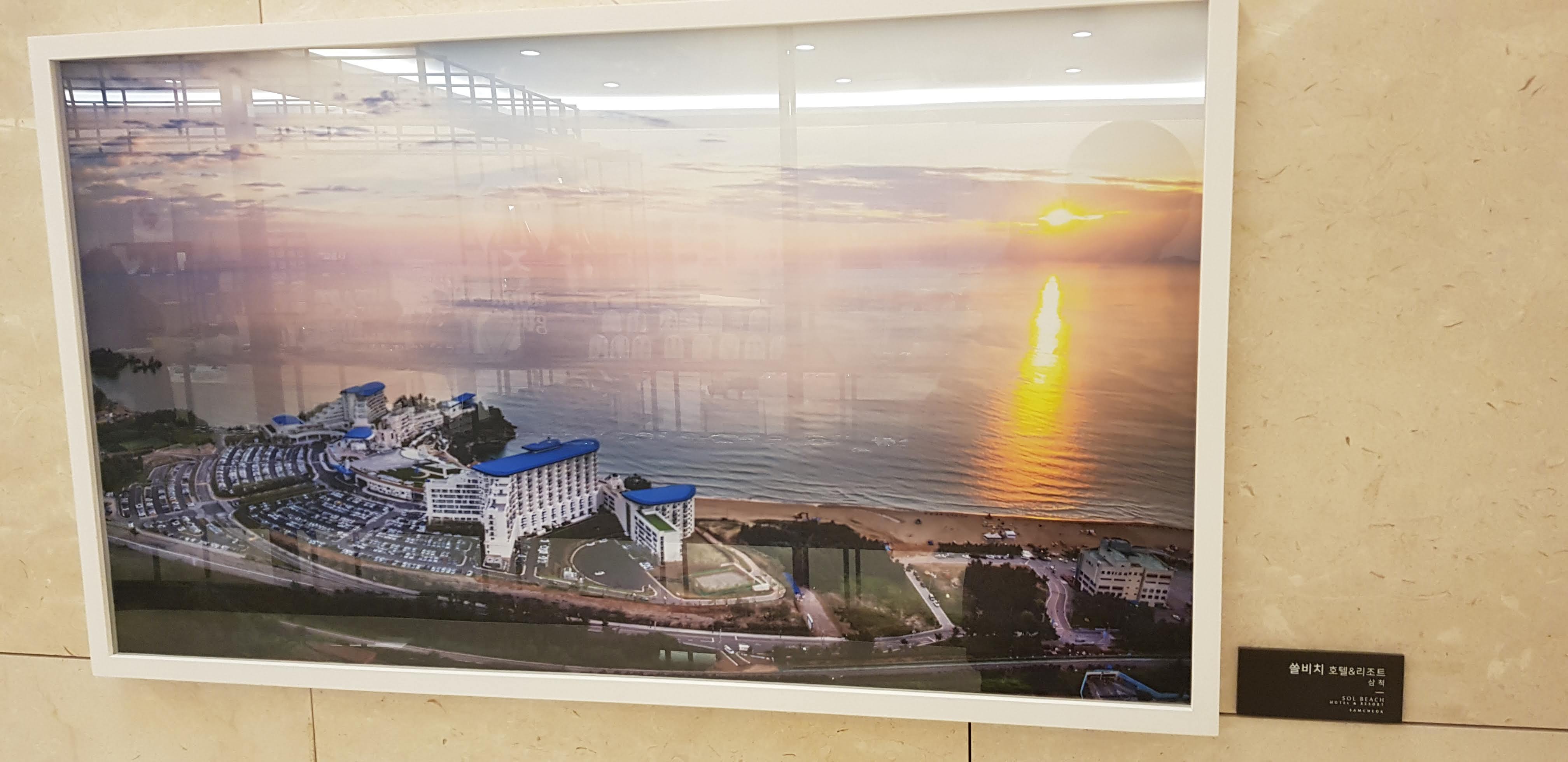 쏠비치 1층 로비에 전시되어 있는 쏠비치 리조트 전경입니다. 오른쪽으로 백사장이 있으며 왼쪽 저멀리 촛대바위도 보입니다.
