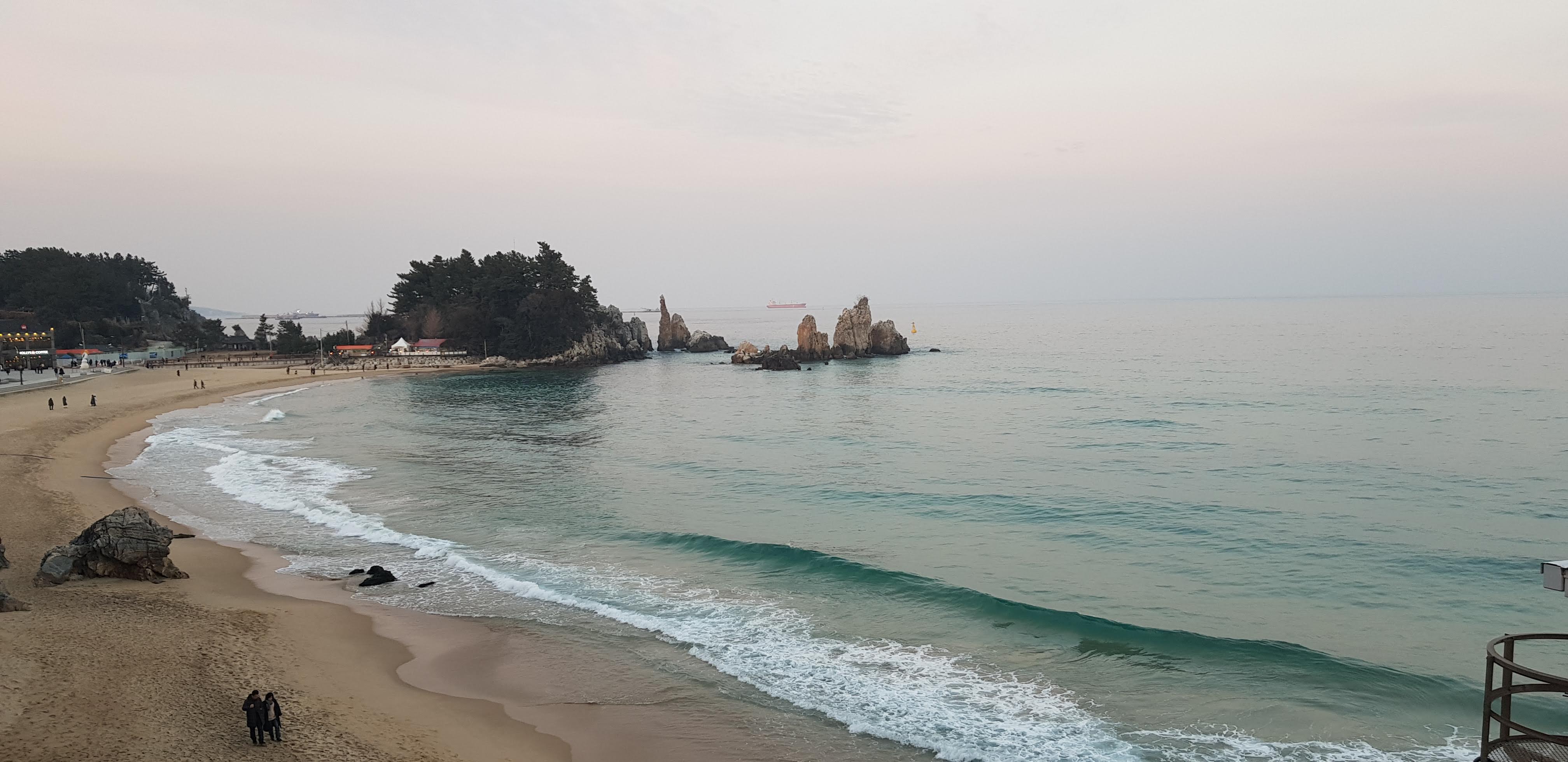 관광객들이 겨울 바다의 분위기를 만끽하고 있습니다. 다들 사진 촬영에 여념이 없는 모습이었습니다. 이 해변의 이름은 '증산 해변'입니다.