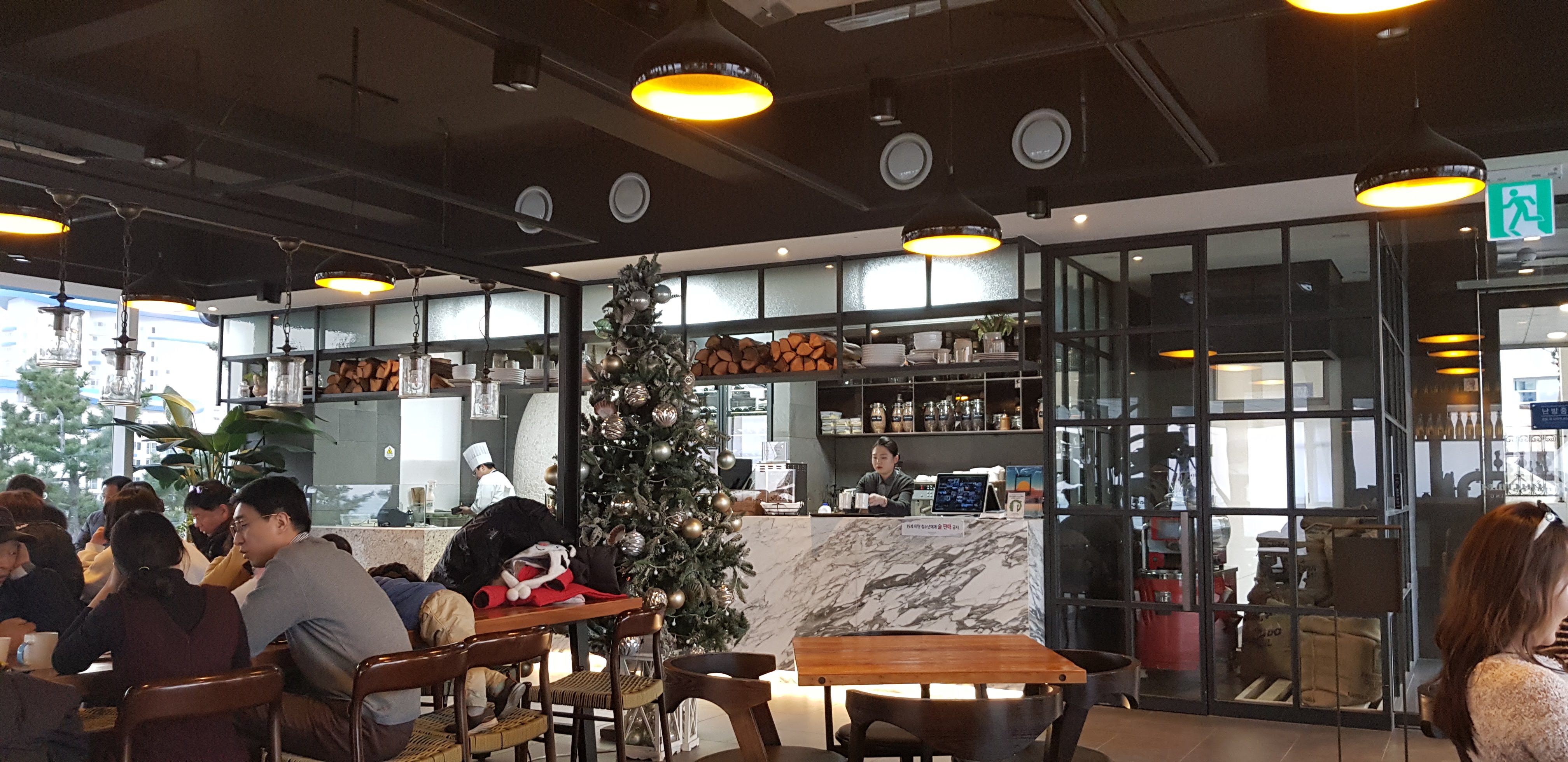 이 날은 좀 추워서 아무도 야외 좌석에 앉지 않았지만 실내 테이블보다 야외에 바닷바람을 맞으며 앉을 수 있는 좌석이 훨씬 더 많습니다.
