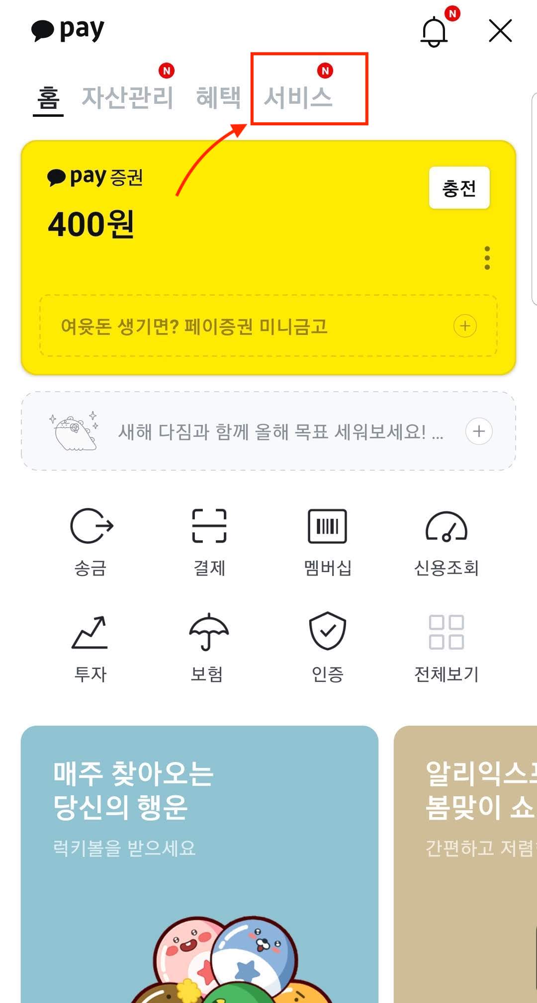 카카오페이 화면에서 '서비스' 탭을 누릅니다.