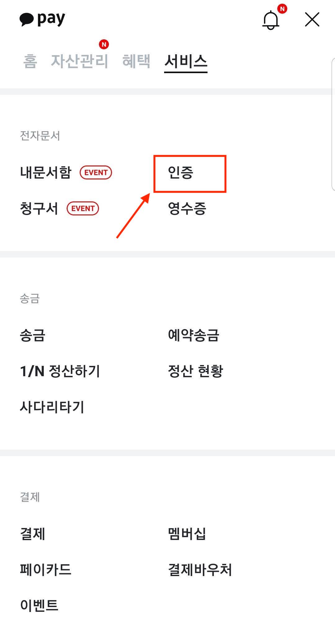 발급된 카카오페이 인증서는 발급한것처럼 카카오톡의 '더보기' -> pay -> 전자서명 -> 인증 화면을 통해서 확인할 수 있습니다.