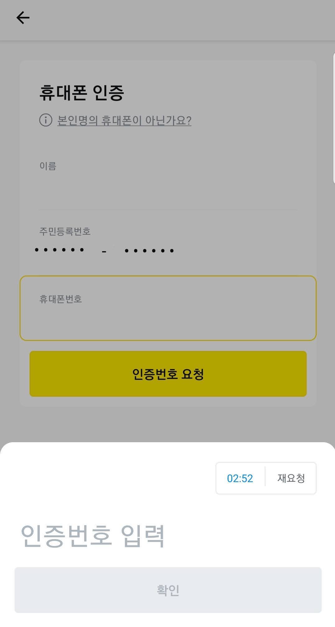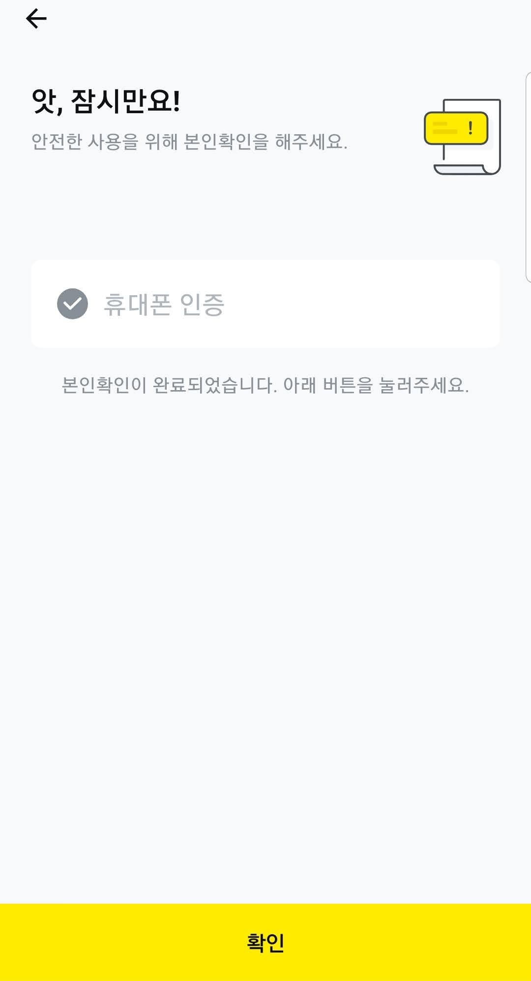 휴대폰 인증이 완료되었습니다. '확인' 버튼을 눌러서 진행합니다.
