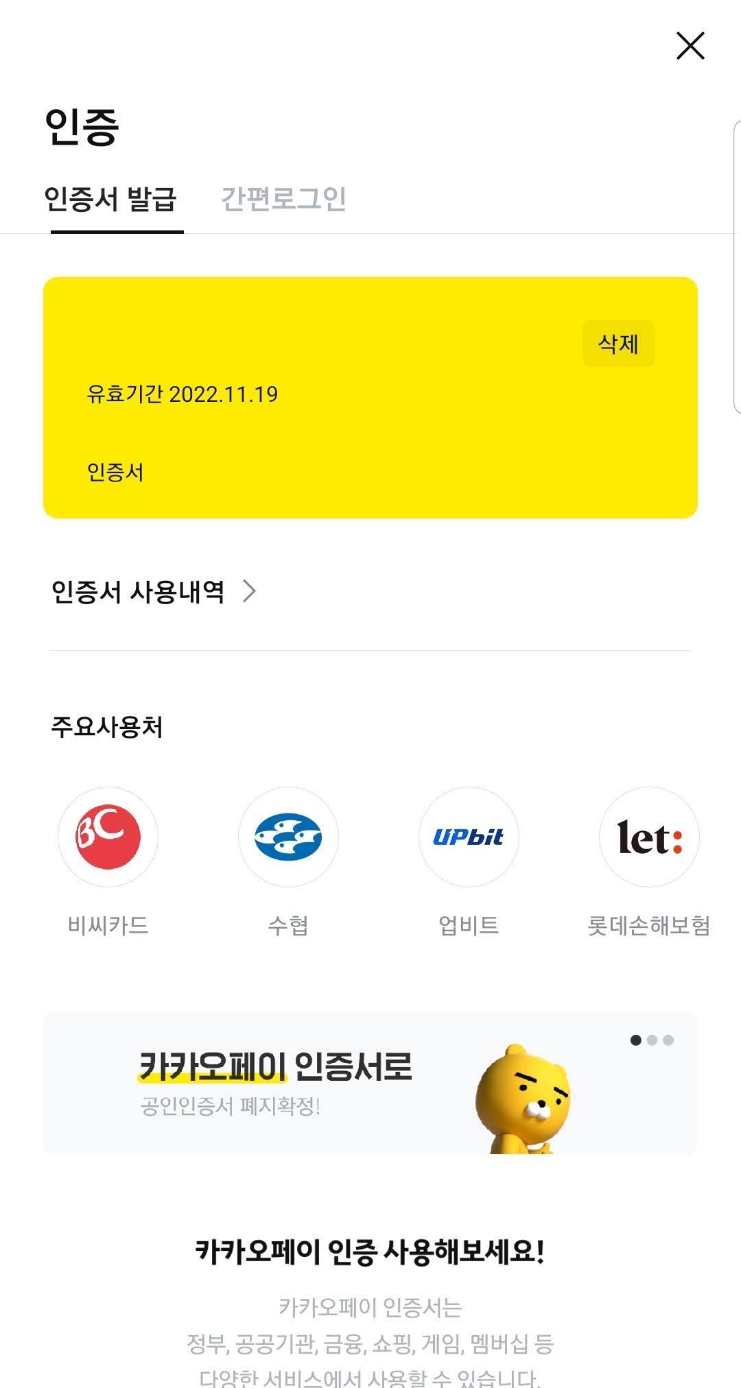 '인증' 화면에서 인증서 부분을 보면 오른쪽에 '삭제'라는 버튼이 있습니다. 이 버튼을 클릭하면 카카오페이 인증서를 삭제할 수 있습니다. 카카오페이 인증서를 삭제하면 사용 내역도 함께 삭제되며 복구되지 않습니다.