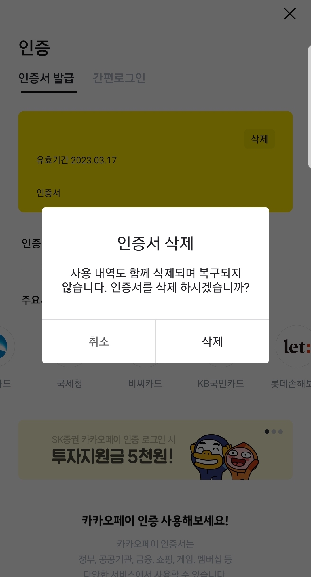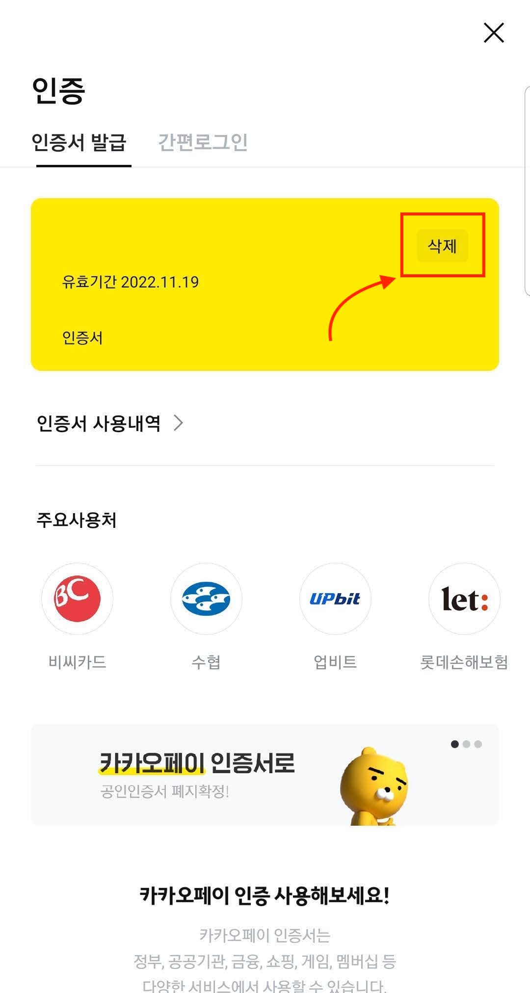 카카오페이 인증서 삭제 방법