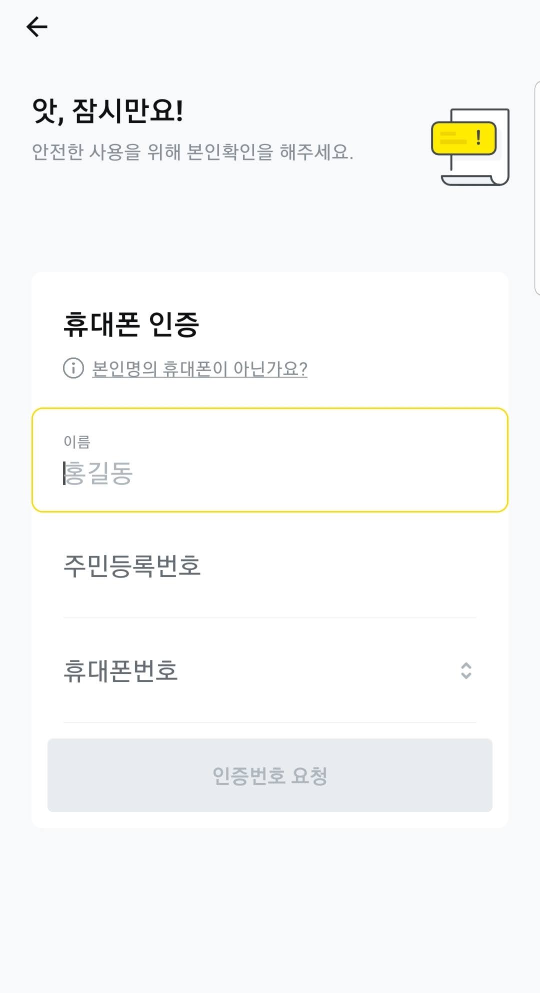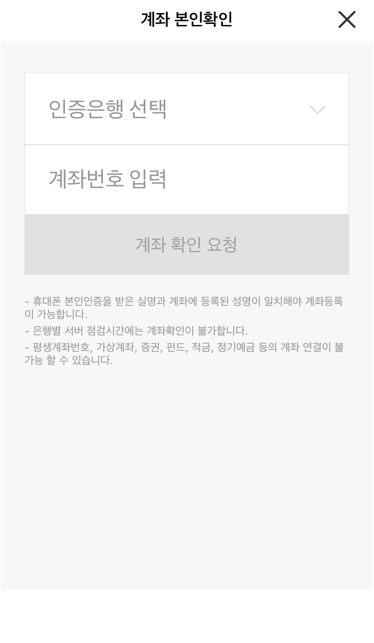 카카오페이 인증서를 발급 받기 위해서는 계좌 인증을 진행해야합니다. 계좌 본인확인 화면에서 본인의 거래 은행과 계좌번호를 입력합니다.