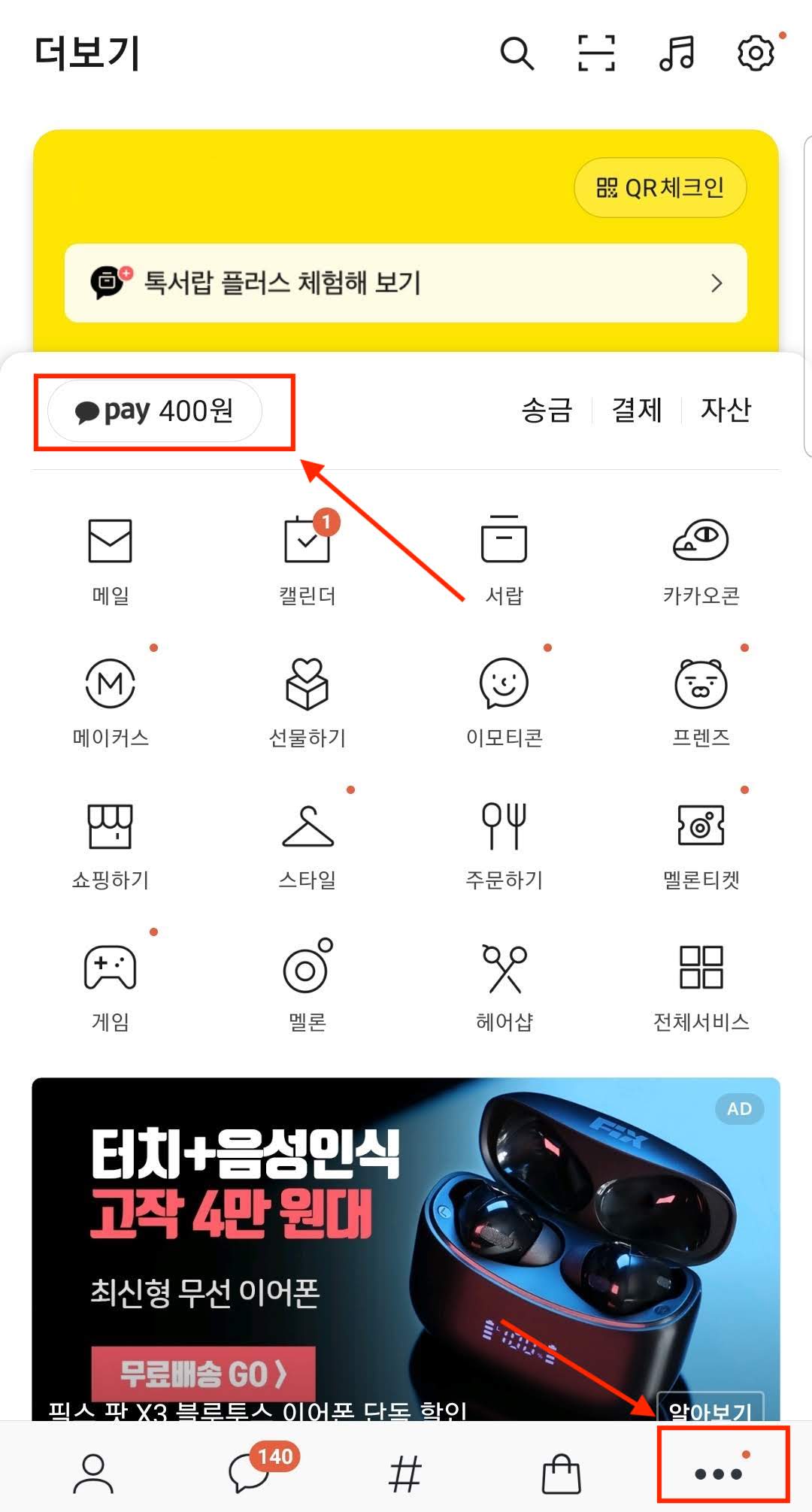 카카오톡 앱의 하단 오른쪽 끝에 더보기 버튼을 누릅니다. 그런 다음 카카오 페이 버튼을 눌러서 카카오 페이 화면을 띄웁니다. (400원 밖에 없네요ㅜㅜ)