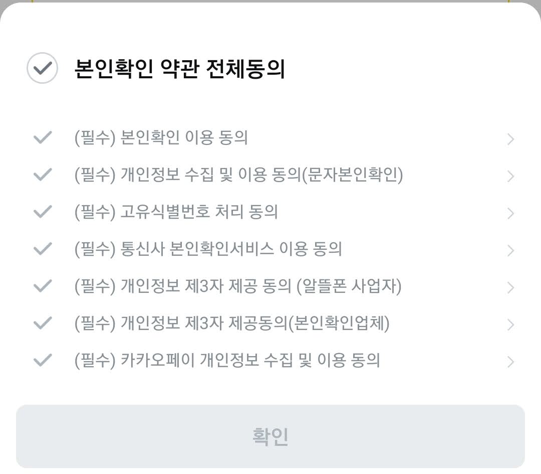 카카오페이 인증서를 발급받기 위해서 본인 인증을 거쳐야합니다. 본인 명의의 휴대전화번호 인증을 해주시기바랍니다. 필수 약관에 대해서 동의를 하시고 확인을 눌러 진행합니다.