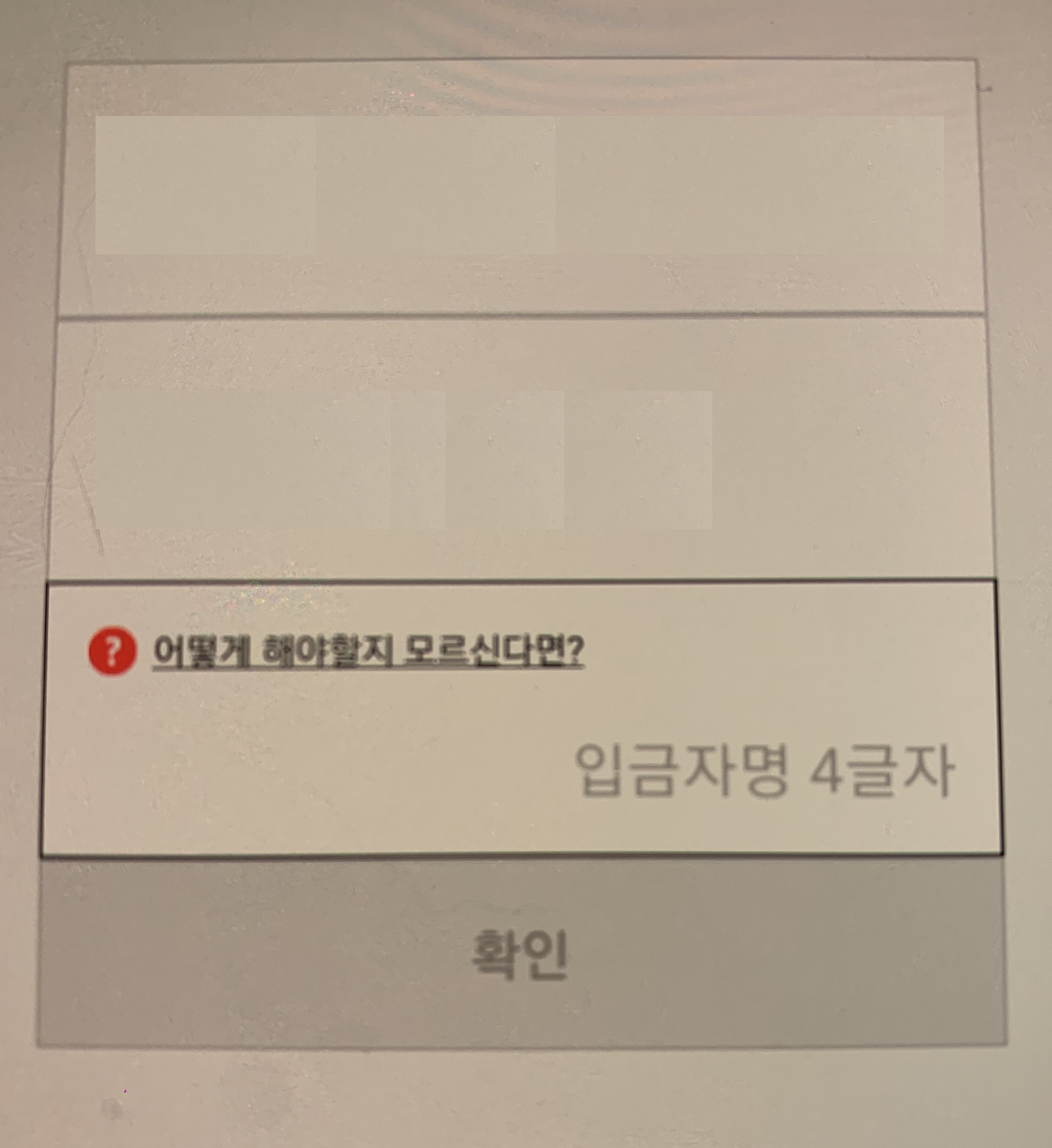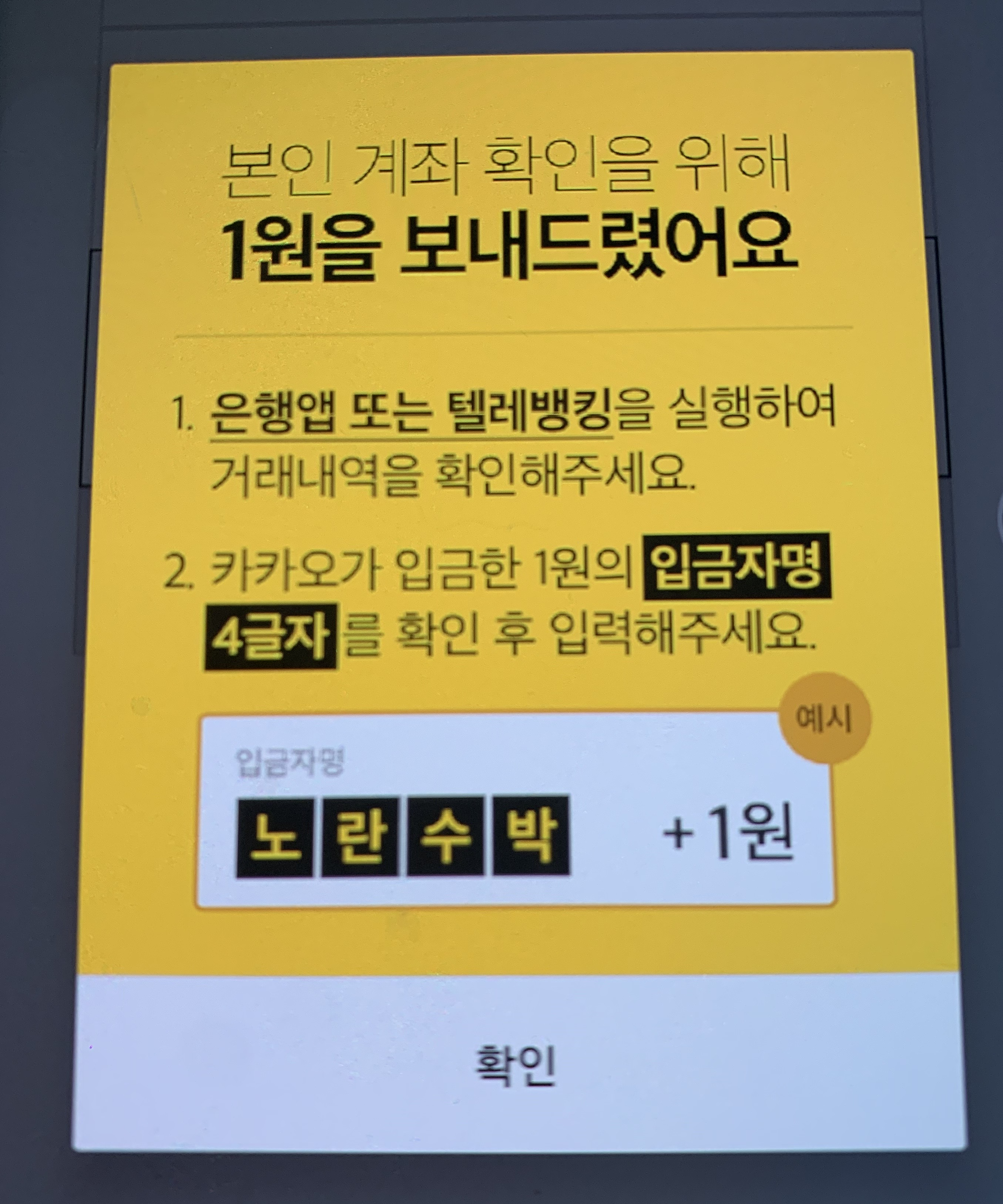 그러면 카카오페이에서 1원을 계좌로 송금하는데요. 입금자 명으로 쓰여진 글자를 입력해줍니다. 입금자명으로 노란수박이 적혀있다면 입금자명 4글자 입력란에 노란수박을 적어주고 '확인' 버튼을 누르면 됩니다.