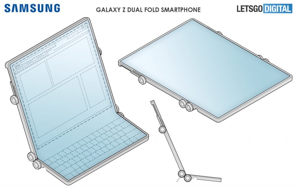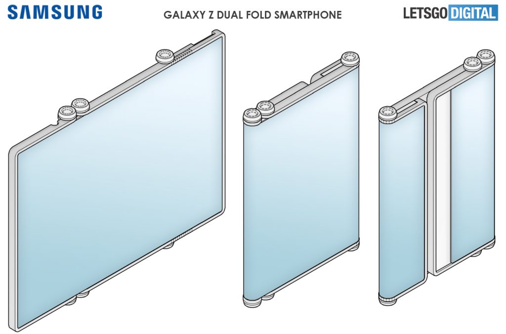 보도에서는 두번 접는 폴더블 스마트폰의 세부 사항이 언급되지는 않았지만 삼성전자는 이미 이중 경첩 디자인에 대한 여러가지 특허를 출원한 것으로 알려졌습니다. 미리미리 준비하고 있었던 것으로 보이는데요. 더블 폴딩 폼팩터도 힌지가 접히는 방식에 따라 여러가지로 구현이 가능합니다.