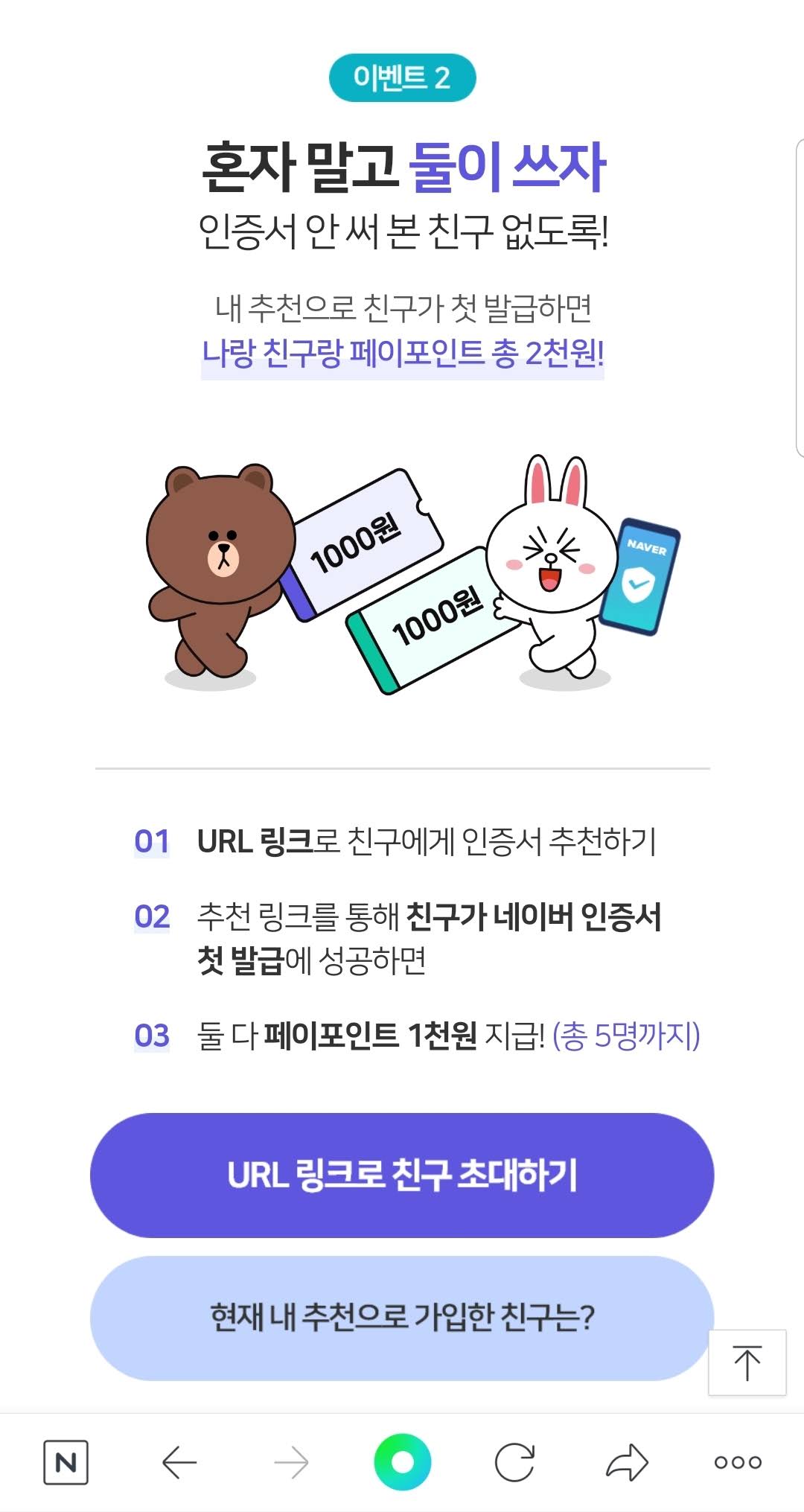 현재 네이버 인증서를 발급 받으면 첫 발급시 네이버 페이 포인트 1천원을 지급하는 이벤트를 진행하고 있습니다. 또 한, 인증서를 안 써본 친구가 없도록 추천한 친구가 네이버 인증서를 발급 받으면 추천한 사람과 추천 받은 사람 모두에게 네이버 페이 포인트가 천원씩 지급됩니다. 친구 추천 이벤트는 총 5명까지 가능합니다.