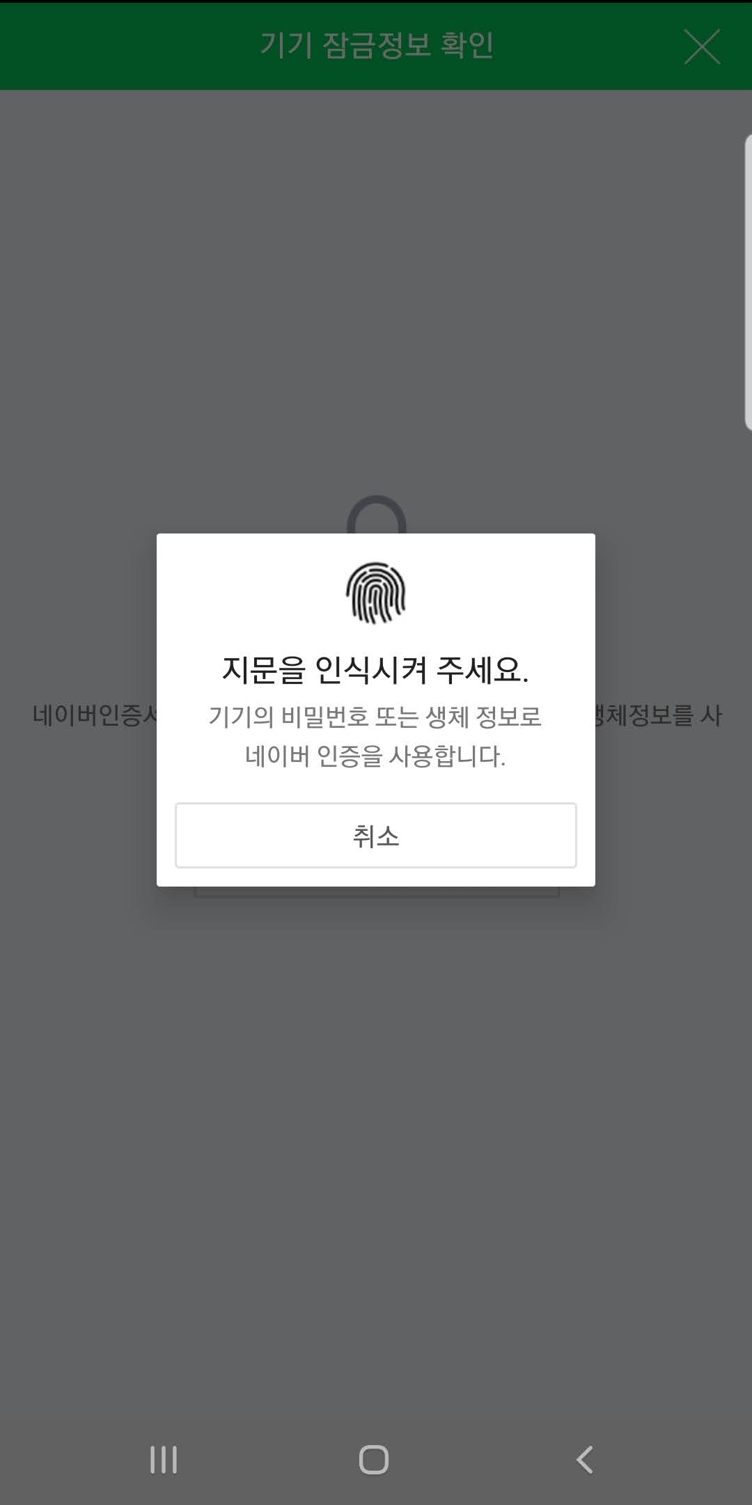 본인확인 약관에 동의하고 본인 명의의 휴대전화 번호를 입력, 본인인증을 진행합니다. 그리고 지문 인식 등 스마트폰이 제공하는 생체 정보를 이용해서 네이버 인증을 사용하도록 합니다.