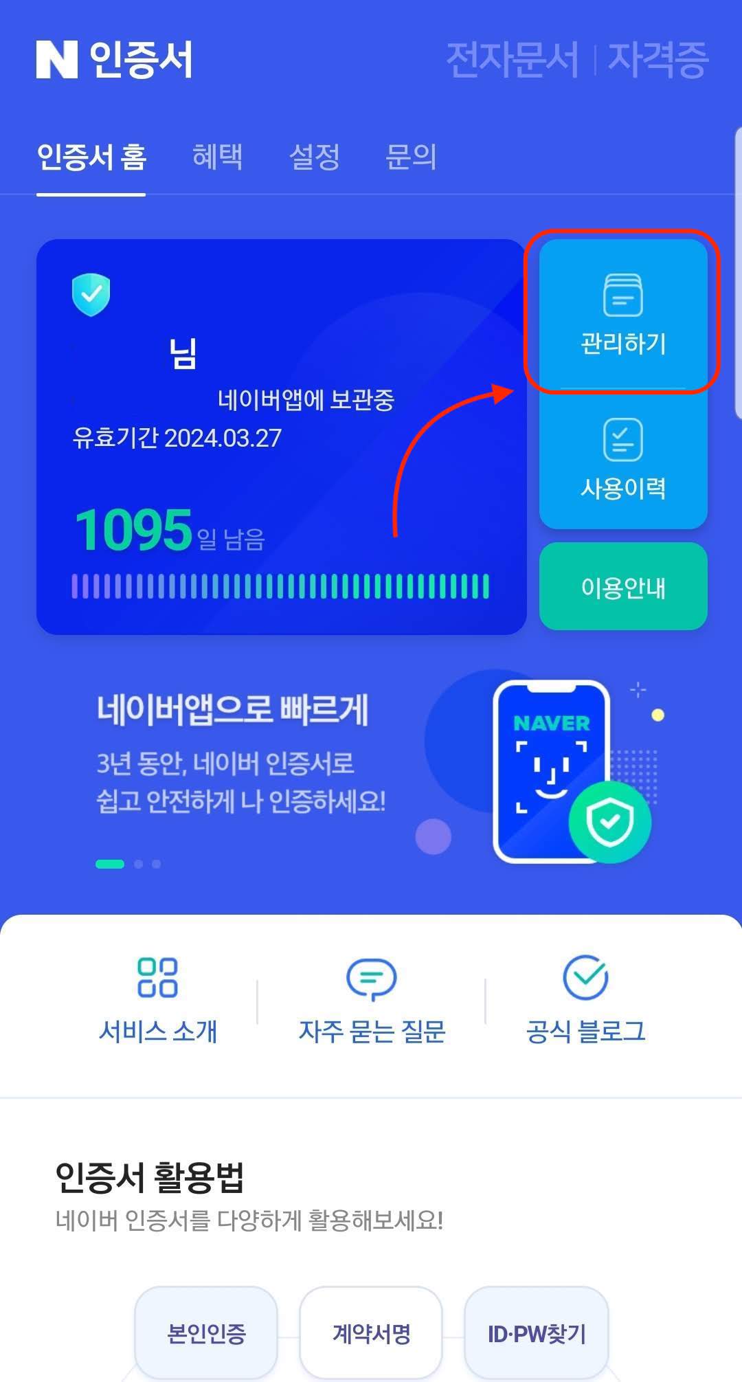 그러면 현재 발급받은 인증서 정보를 확인할 수 있습니다. 발급받은 시간과 남은 유효기간 등을 확인할 수 있습니다. 인증서 정보가 출력되는 화면 오른쪽에 '관리하기' 버튼을 누르면 인증서를 삭제할 수 있는 화면이 나옵니다.