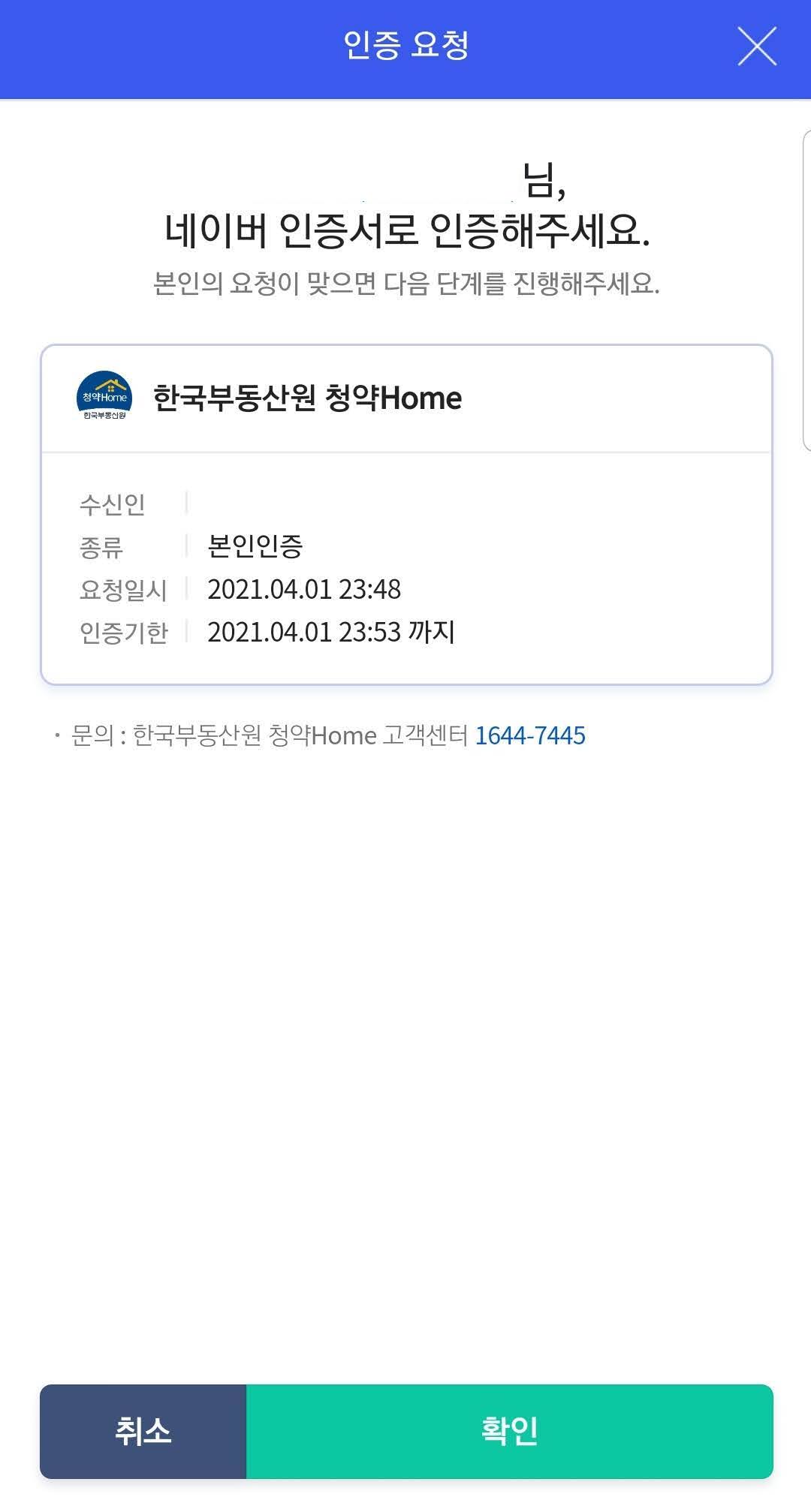 네이버 앱을 열면 인증 요청에 대한 내용이 나옵니다. 청약홈에서 보낸 인증요청이 맞는지 확인한 다음 '확인' 버튼을 눌러서 인증을 진행합니다. 네이버 인증서 비밀번호를 입력하거나 지문인식, 홍채인식 등의 스마트폰이 제공하는 바이오 인식 기능을 이용해서 본인 확인을 하면 됩니다.