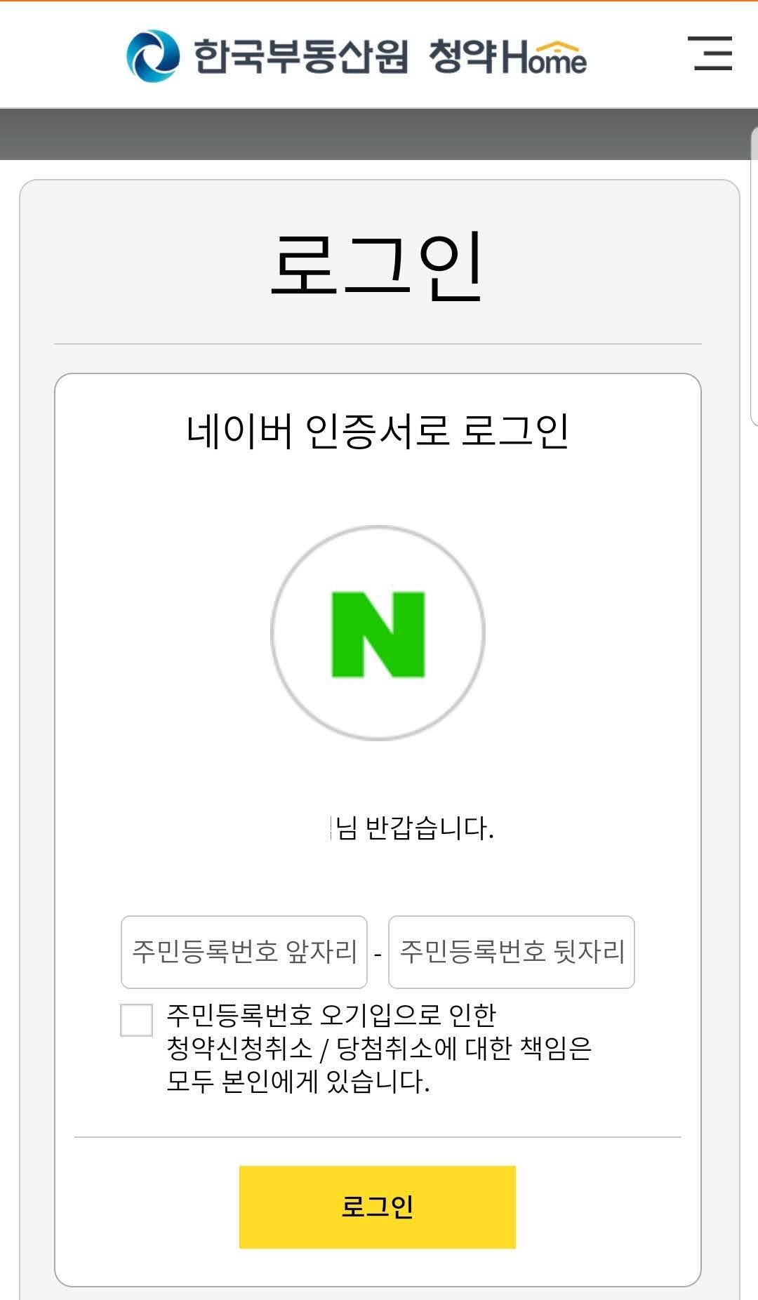 네이버 앱에서 네이버 인증서로 본인확인을 하게 되면 로그인이 완료됩니다. 마지막으로 한번더 주민등록 번호를 입력하고 '로그인' 버튼을 누르면 네이버 인증서를 이용한 청약홈 로그인이 완료됩니다.