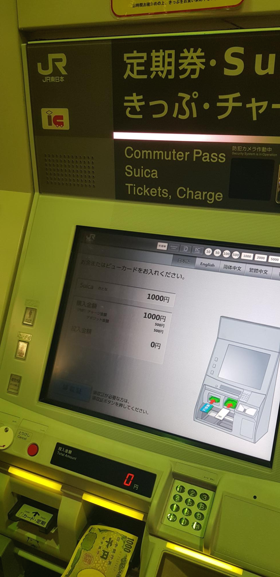 1000엔을 넣고 충전을 합니다. 사진에는 일본어가 쓰여 있지만 영어와 한국어 안내 버튼도 있습니다.