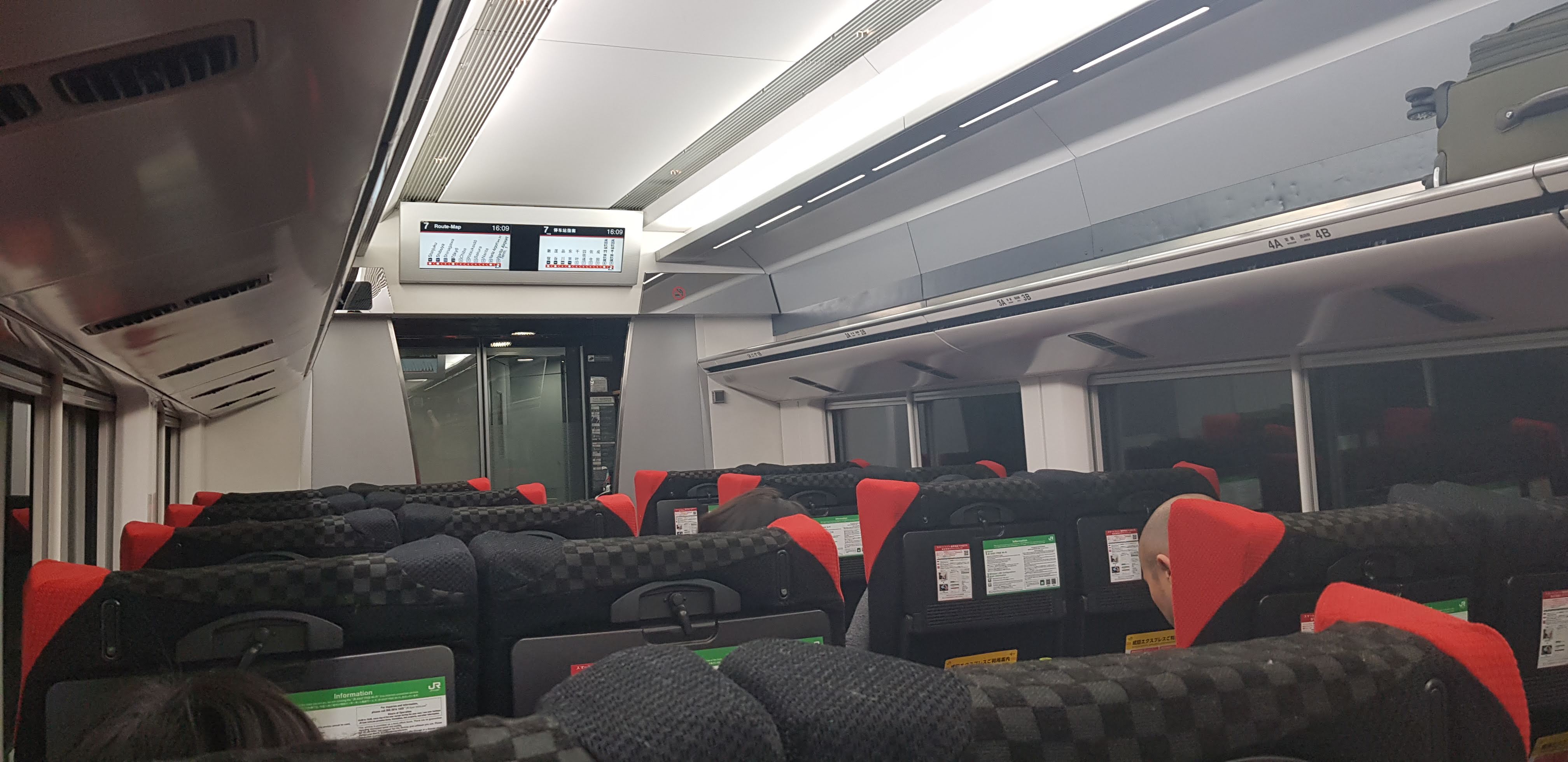 깔끔한 NEX 열차 내부. 넓은 좌석과 편안한 좌석이 빠른 속도로 도쿄 시내까지 안내해줍니다.