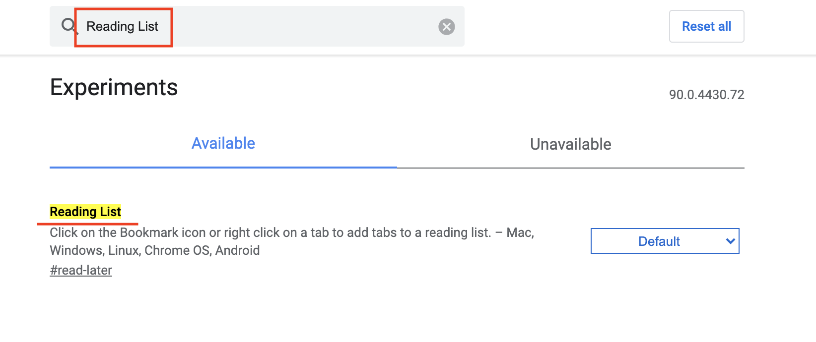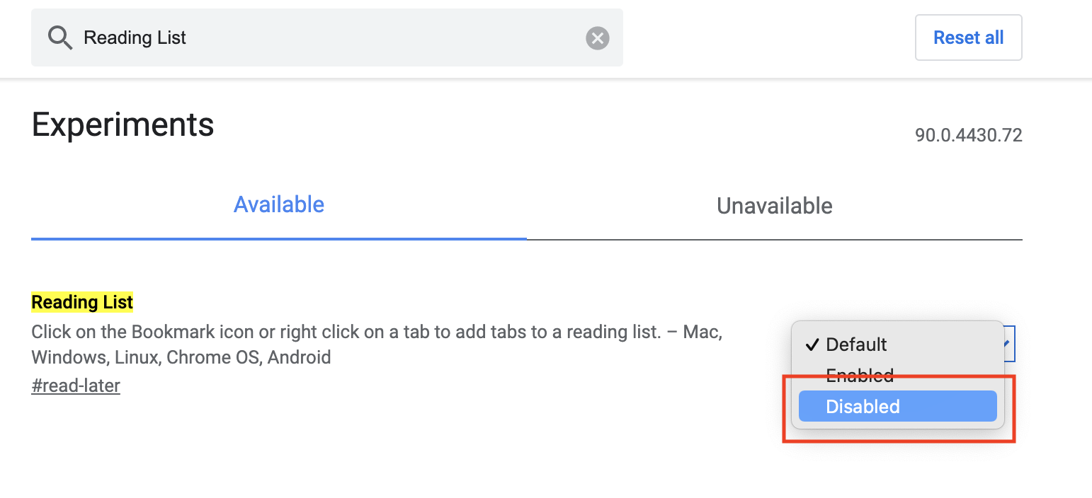 2. flags 페이지의 검색 창에 "Reading List"를 입력합니다. 그러면 읽기 목록을 끌 수 있는 설정이 나옵니다.