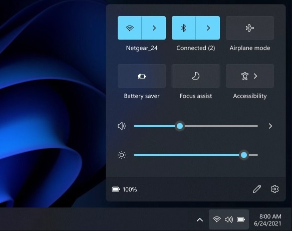 기존 윈도우 10에서는 하나로 통합되어 있었던 제어센터와 알림센터가 분리되었습니다. 우측 하단에 있는 아이콘을 누르면 제어센터 메뉴가 활성화되고, 시계를 누르면 알림 센터가 활성화됩니다.