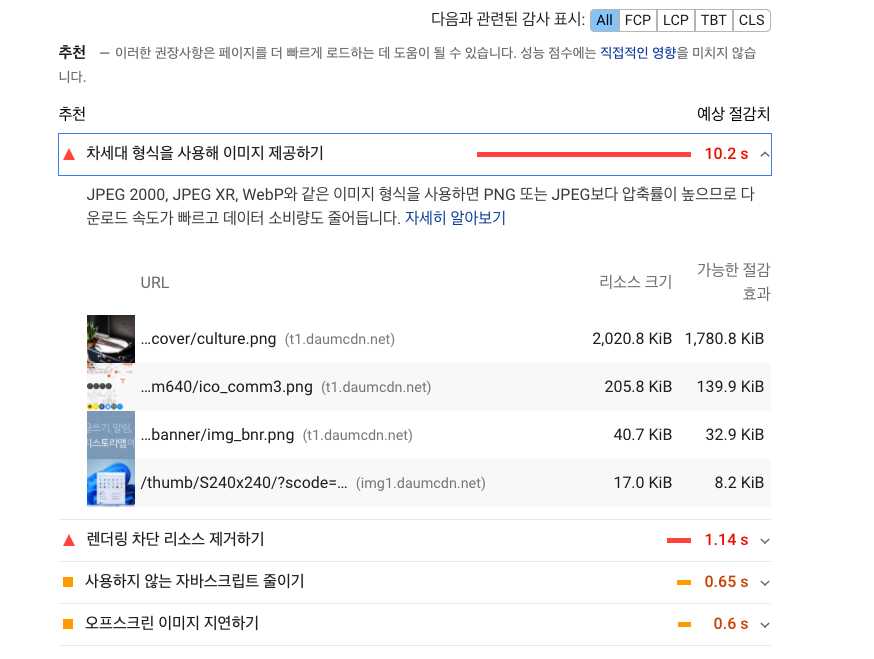 아래쪽으로 스크롤을 내려보면 페이지의 로딩속도를 개선하기 위해 어떤 작업을 해주면 좋은지 추천해줍니다. 예를 들어 포스트 본문에 사용한 이미지의 사이즈가 지나치게 큰 경우 로딩 속도를 느리게 만들 수 있습니다. 이럴 때에는 PNG 같은 차세대 이미지 포맷을 사용해서 빠른 로딩속도를 지원하도록 수정하는게 좋습니다.