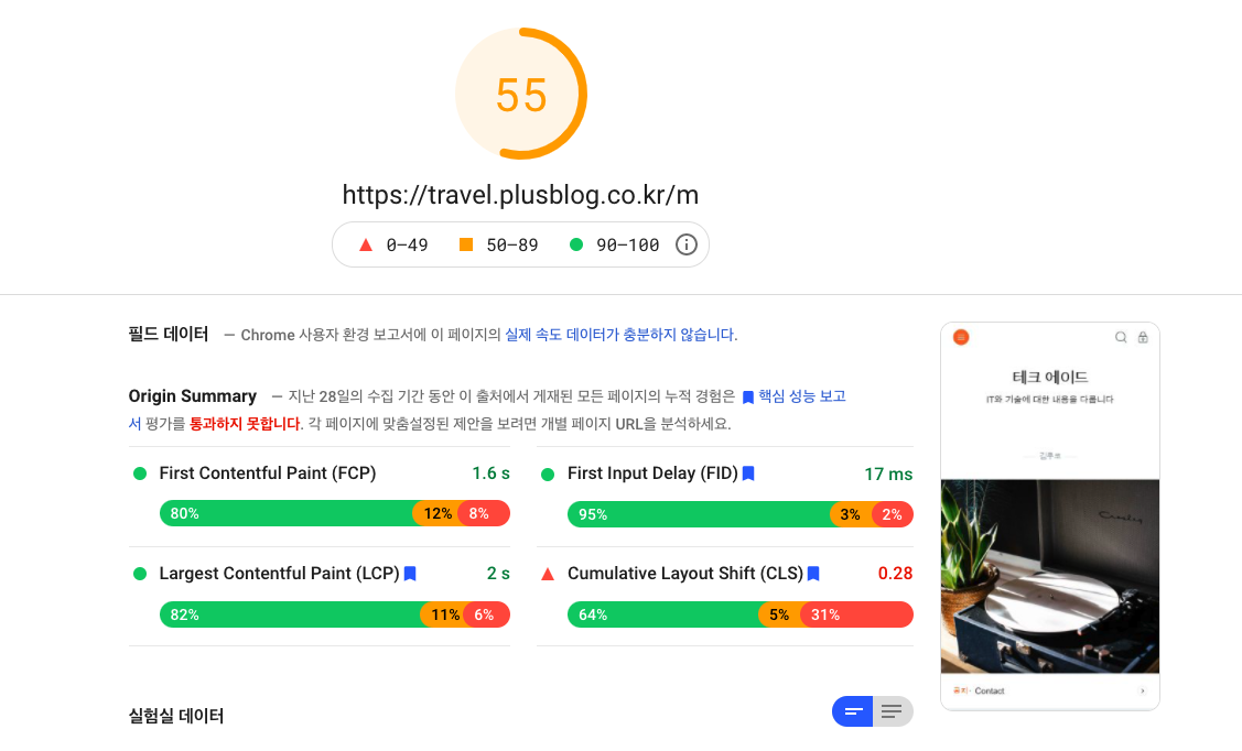 분석 결과를 보면 100점 만점에 로딩속도가 어느 정도인지 점수로 나타내줍니다. 제 블로그의 첫 페이지는 55점이네요;;;